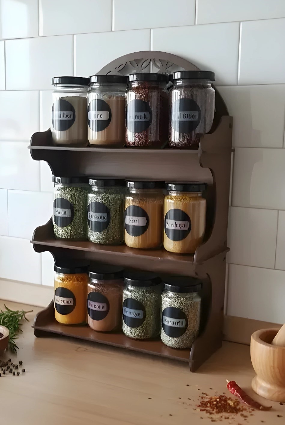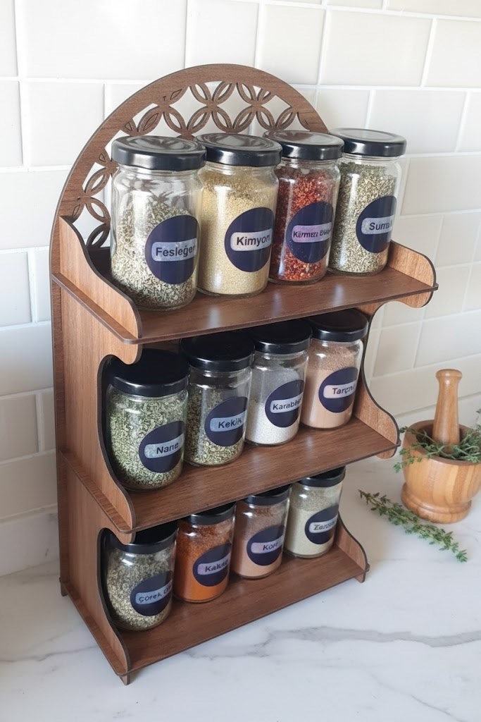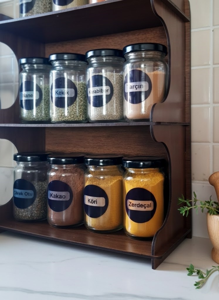 Mutfağınızda düzen ve şıklığı bir araya getiren meşe tonlarında ahşap görünümlü dekoratif MDF standlı 12’li baharatlık seti, cam kavanozları ve modern tasarımıyla tezgâhınıza estetik bir görünüm kazandırır. Günlük kullanım için ideal ölçülerde tasarlanmış olup hem dekoratif hem işlevsel bir çözüm sunar.