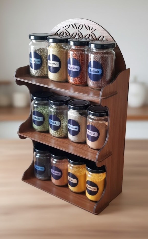 Stand, meşe tonlarında ahşap görünümlü 3 mm MDF lazer kesim malzemeden üretilmiştir. Geçmeli sistem sayesinde kolay kurulum sağlar ve kurulduğunda kavanoz ağırlığını dengeli şekilde taşıyacak sağlam bir yapı oluşturur.