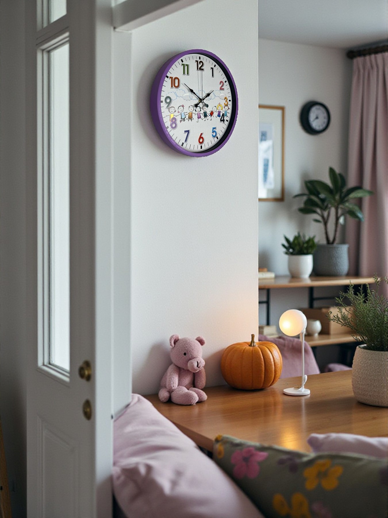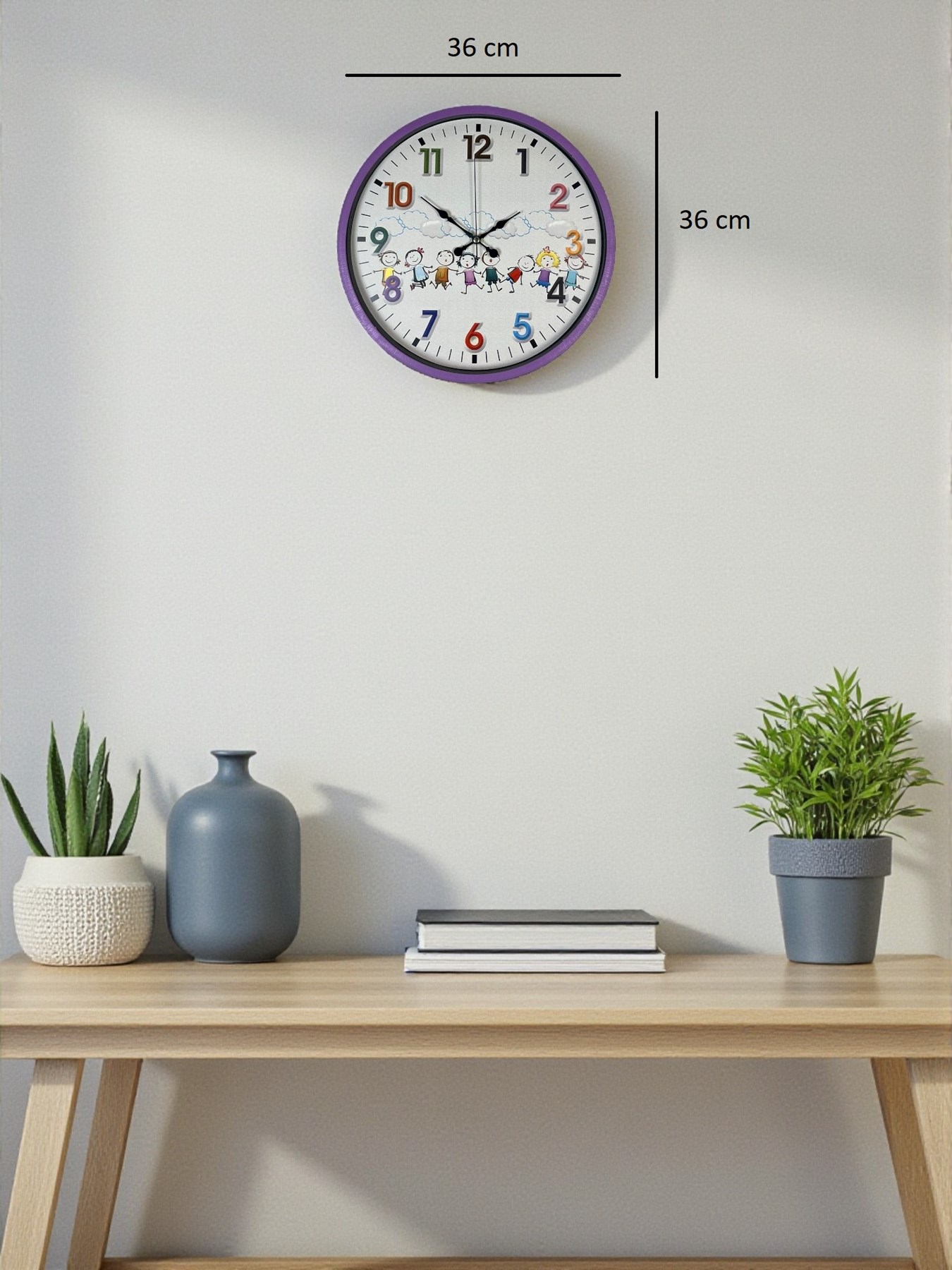 Canlı mor çerçevesi, renkli rakamları ve sevimli çocuk figürleriyle tasarlanan bu 36 cm çocuk odası duvar saati, çocukların yaşam alanlarına neşe ve sıcaklık katar. Eğlenceli tasarımı sayesinde çocukların saat kavramını kolayca öğrenmesine yardımcı olurken, odanın dekorasyonuna da enerjik bir dokunuş kazandırır.