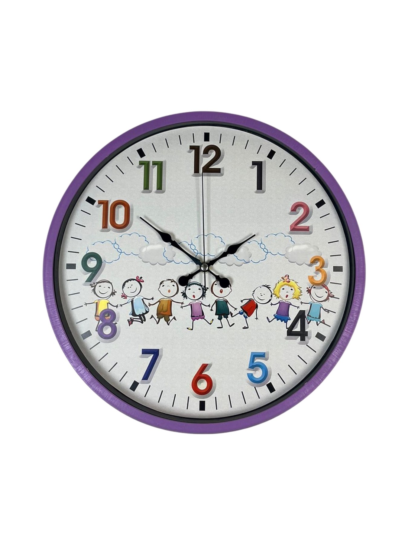 Büyük ve renkli rakamlar, çocukların saati rahatlıkla okuyabilmesini sağlar. Kadran üzerinde yer alan bulutlar ve el ele tutuşan çocuk figürleri, ürünü hem dekoratif hem de eğitici hale getirir. Sessiz ve akıcı mekanizması, tik-tak sesi oluşturmadığı için çocukların uyku ve ders zamanlarında rahatsızlık vermez.