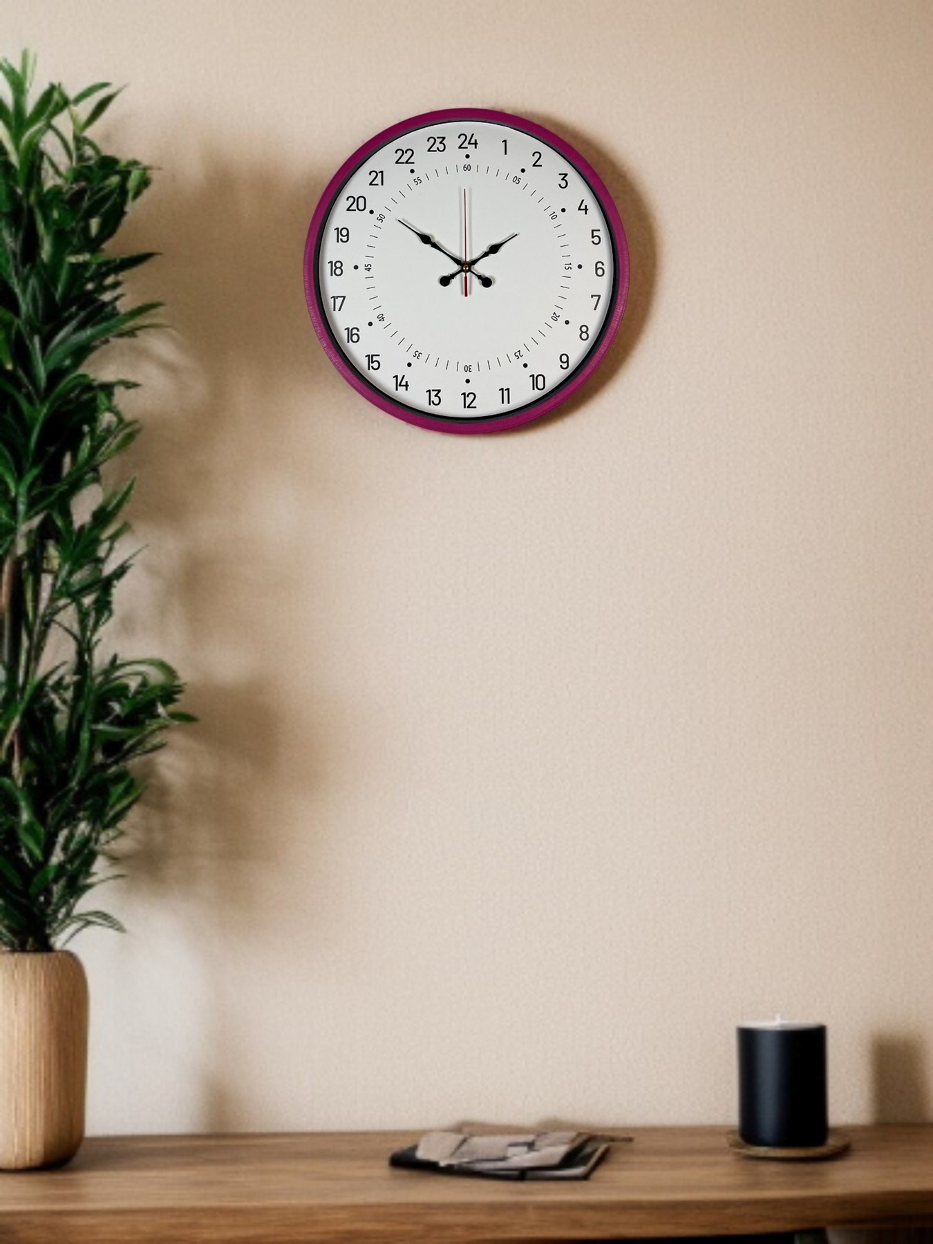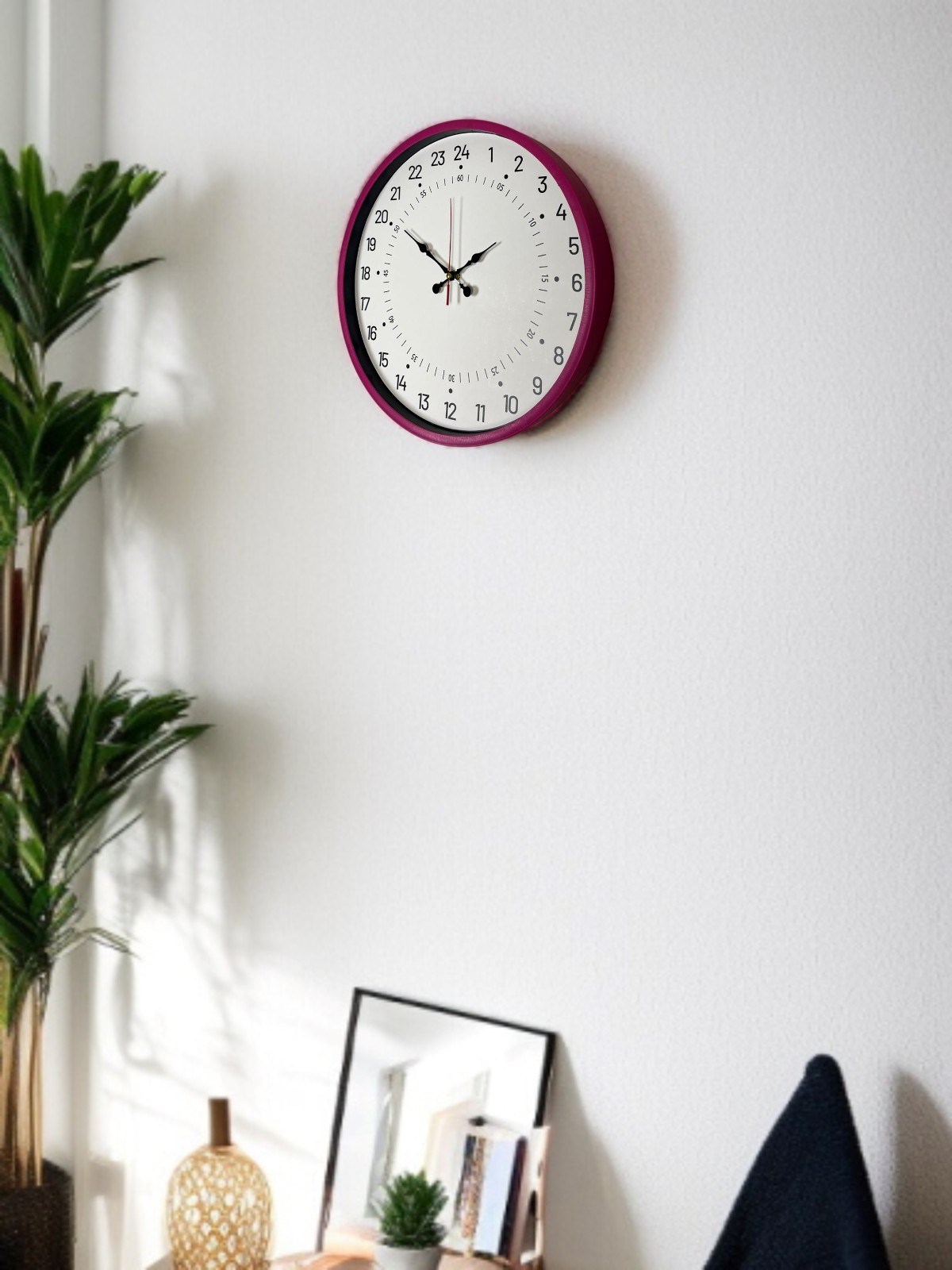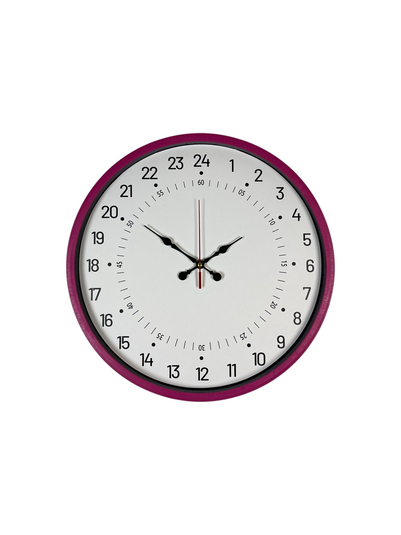 Canlı pembe çerçevesi, sade beyaz kadranı ve net siyah rakamlarıyla hem modern hem de dikkat çekici bir görünüm sunar. İç ve dış halkada yer alan 24 saatlik zaman göstergesi, zamanı daha bilinçli ve düzenli takip etmeye yardımcı olur.