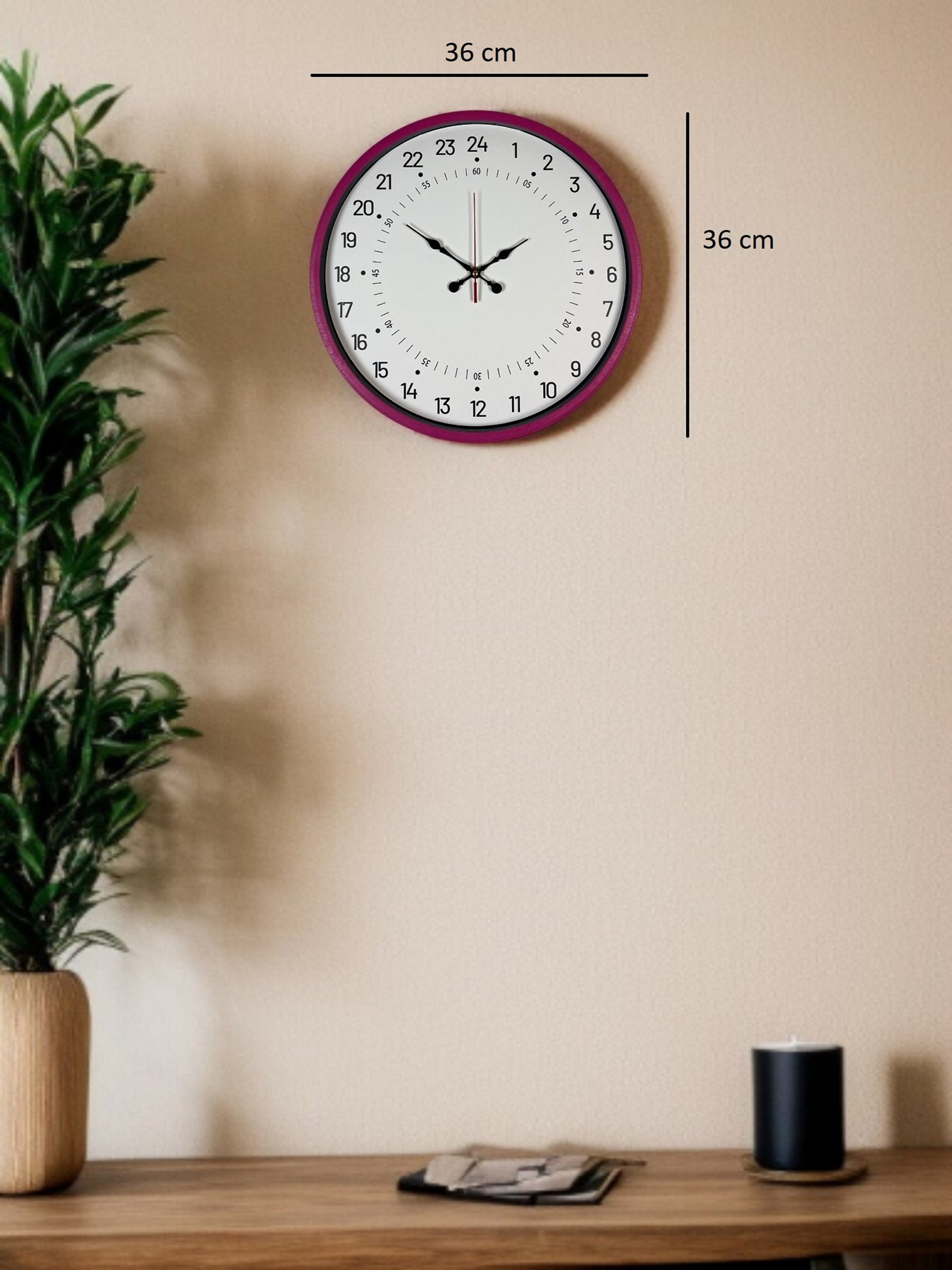 Klasik duvar saatlerinden ayrılan 24 saatlik tek kadranlı özel tasarımı ile öne çıkan bu 36 cm pembe duvar saati, günün tamamını tek bakışta görmeyi sağlayarak zaman algısını güçlendirir. Alışılmış 12 saatlik saatlerden farklı yapısı sayesinde özellikle eğitim, çalışma ve vardiyalı kullanım için ideal bir çözümdür.