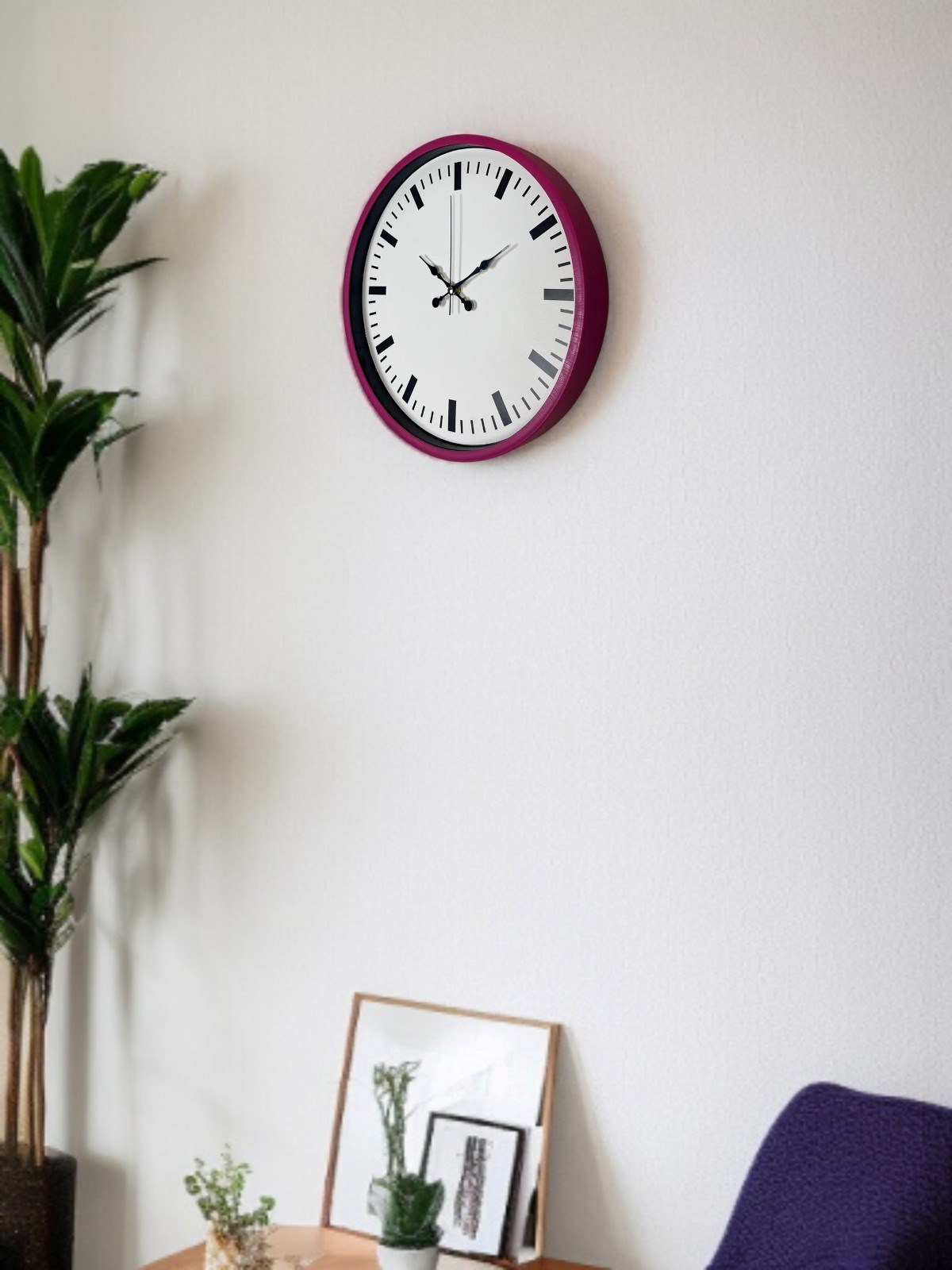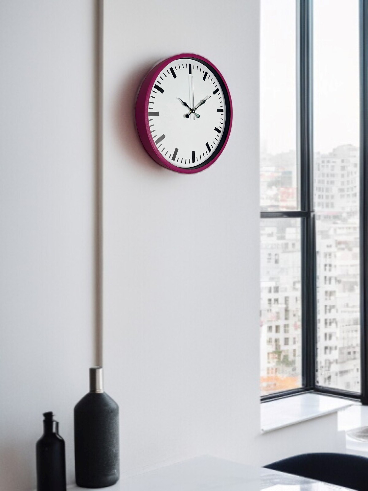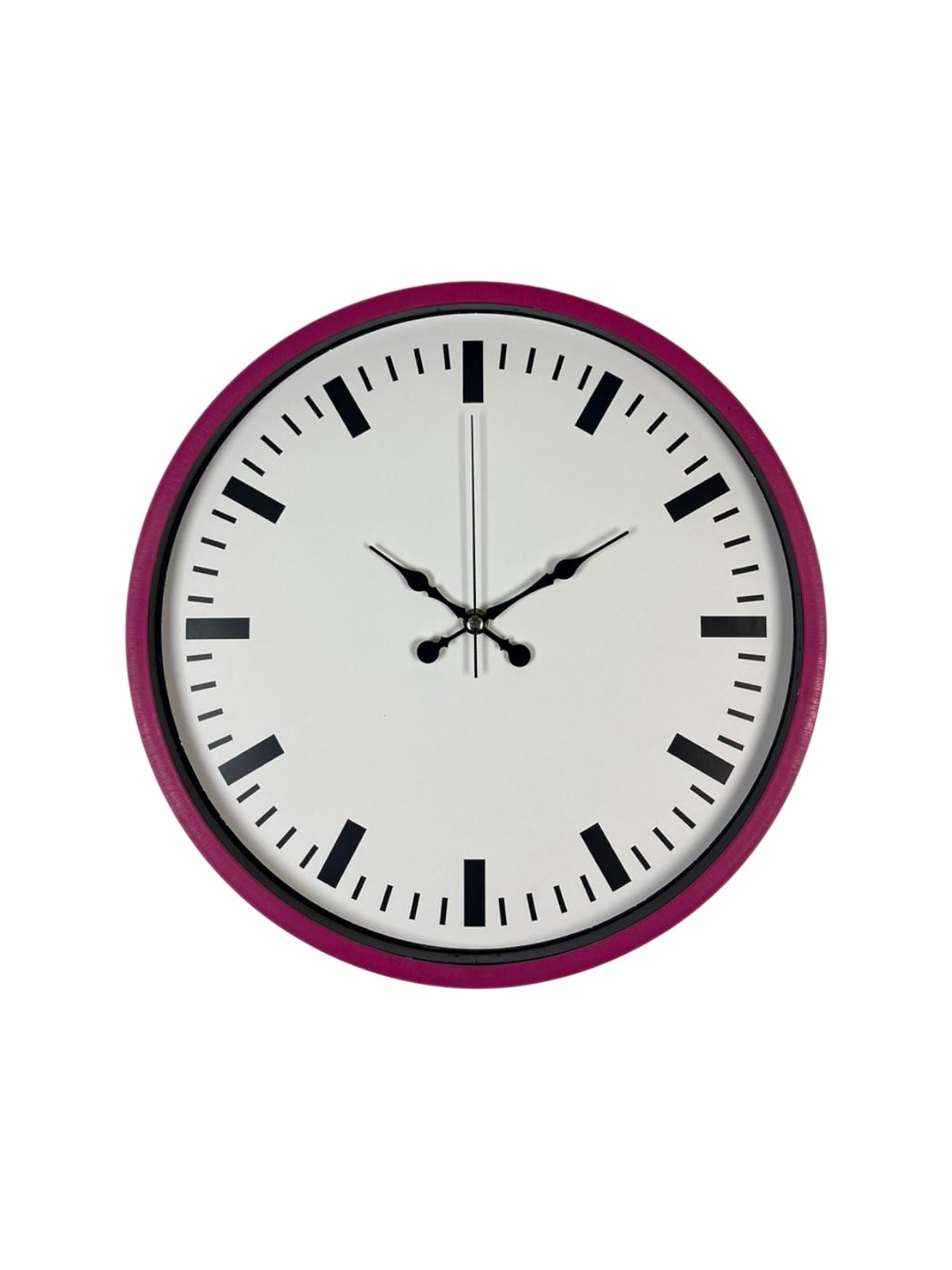 Canlı pembe çerçevesi ve sade beyaz kadran tasarımıyla öne çıkan bu 36 cm duvar saati, yaşam alanlarına enerjik ve modern bir dokunuş kazandırır. Minimal indeks yapısı sayesinde saati uzaktan dahi kolayca okumak mümkündür.