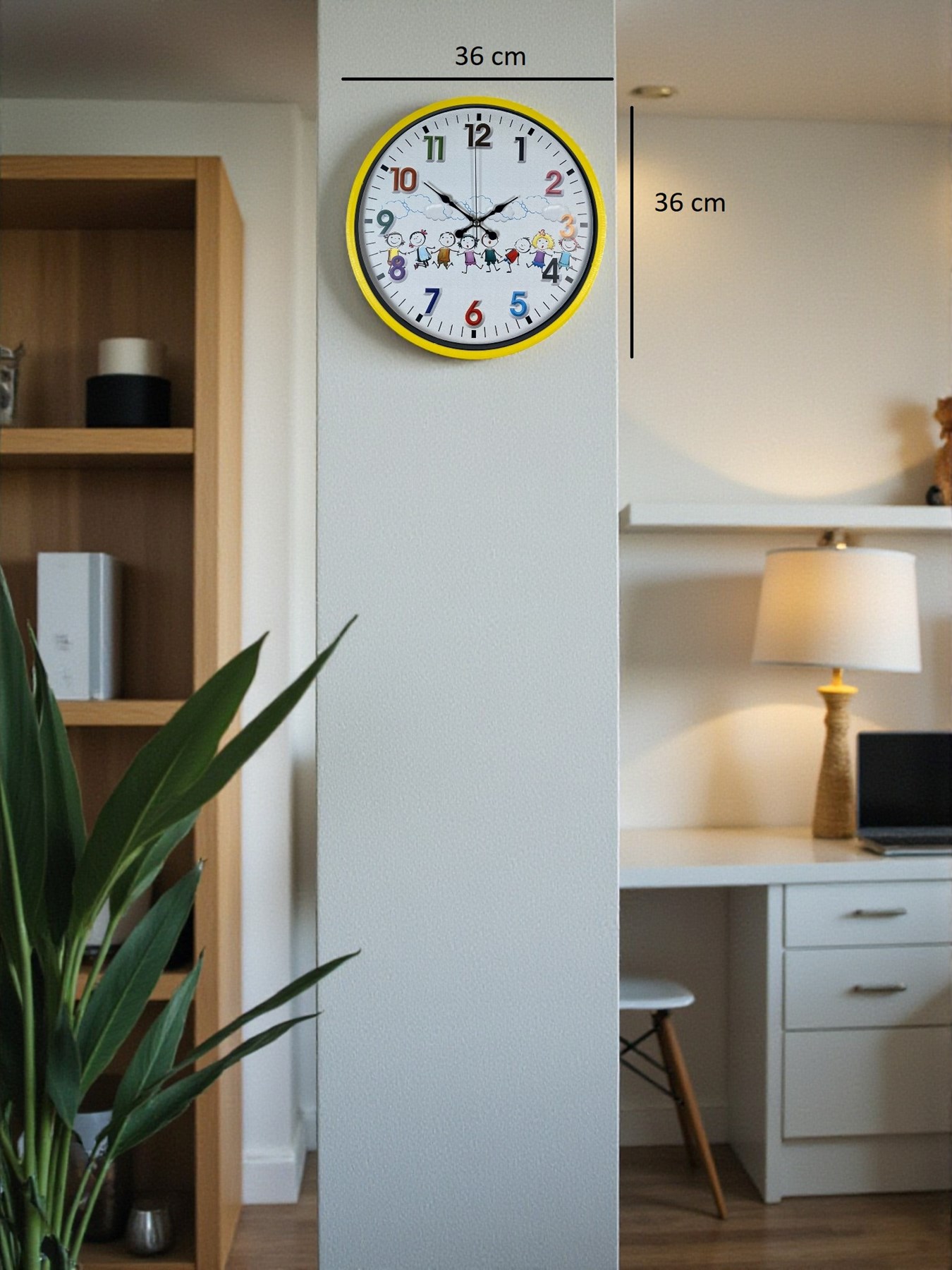 Canlı sarı çerçevesi, renkli rakamları ve sevimli çocuk figürleriyle tasarlanan bu 36 cm çocuk odası duvar saati, çocukların yaşam alanlarına neşe ve enerji katar. Eğlenceli kadran tasarımı sayesinde çocukların saat kavramını öğrenmesini desteklerken, odanın dekorasyonuna da sıcak bir dokunuş kazandırır.