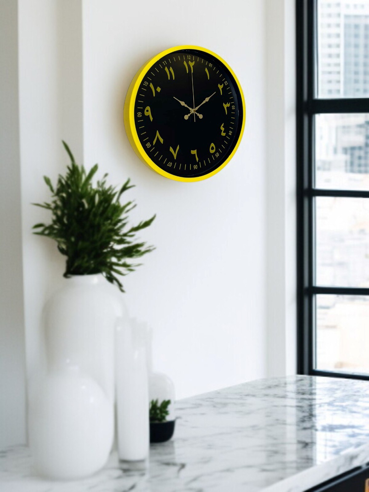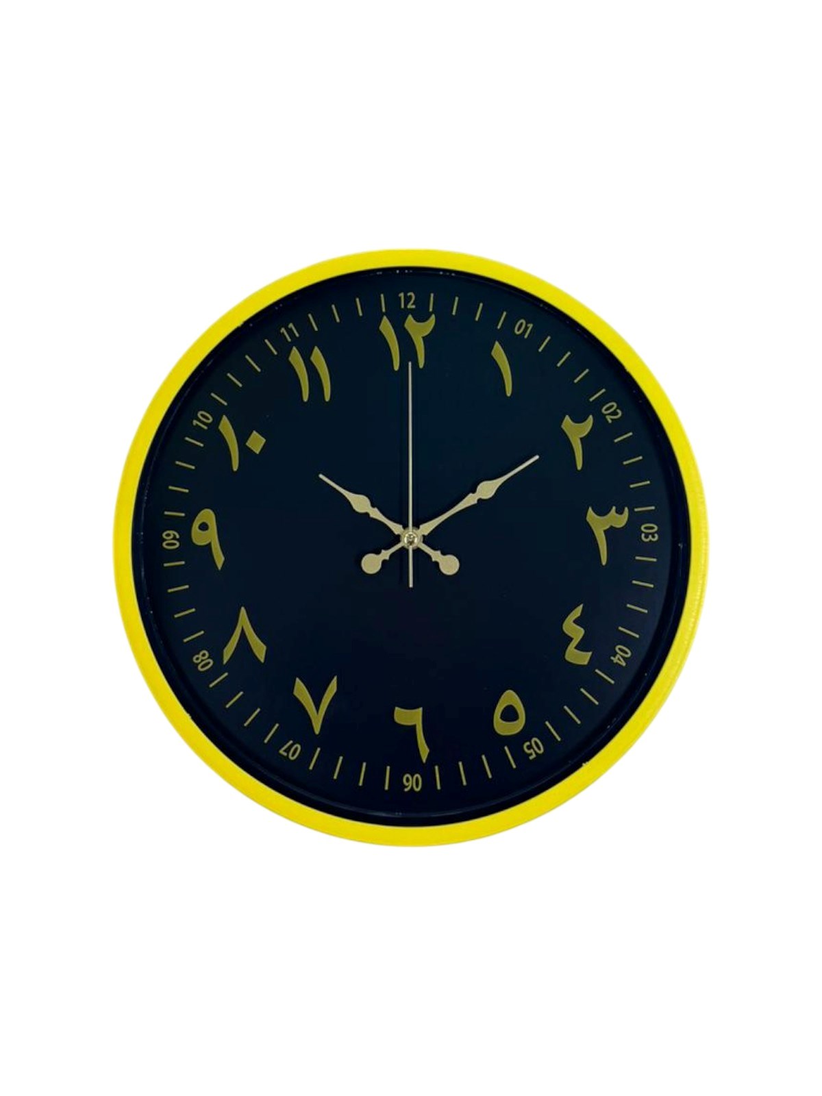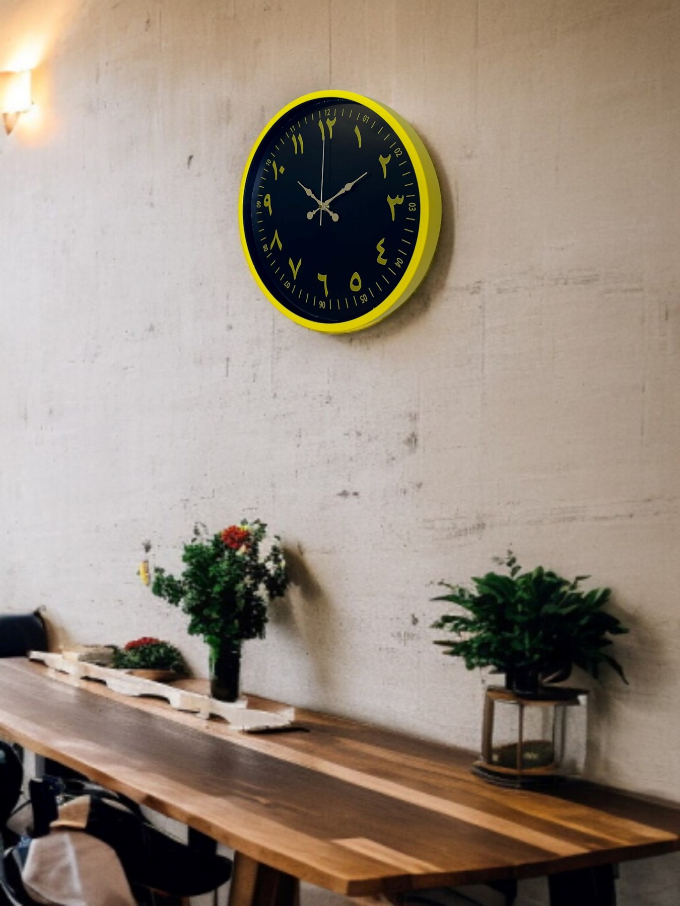 Canlı sarı çerçevesi ve koyu renk kadranı üzerinde yer alan Arapça rakamları ile tasarlanan bu 36 cm duvar saati, klasik estetiği modern bir çizgiyle buluşturur. Altın tonlu rakamlar ve akrep-yelkovanlar, yüksek kontrast sayesinde saati uzaktan dahi net biçimde okunur kılar.