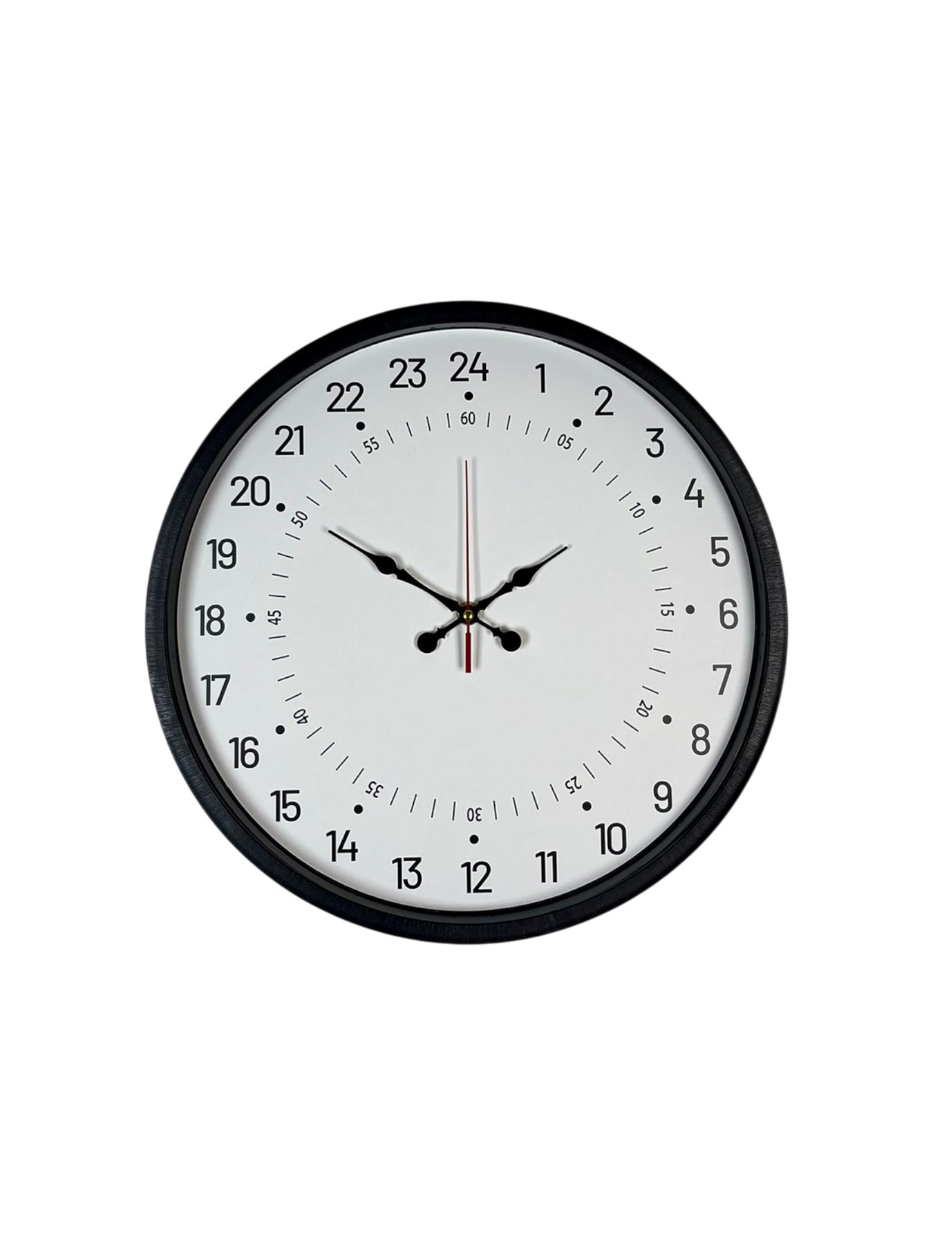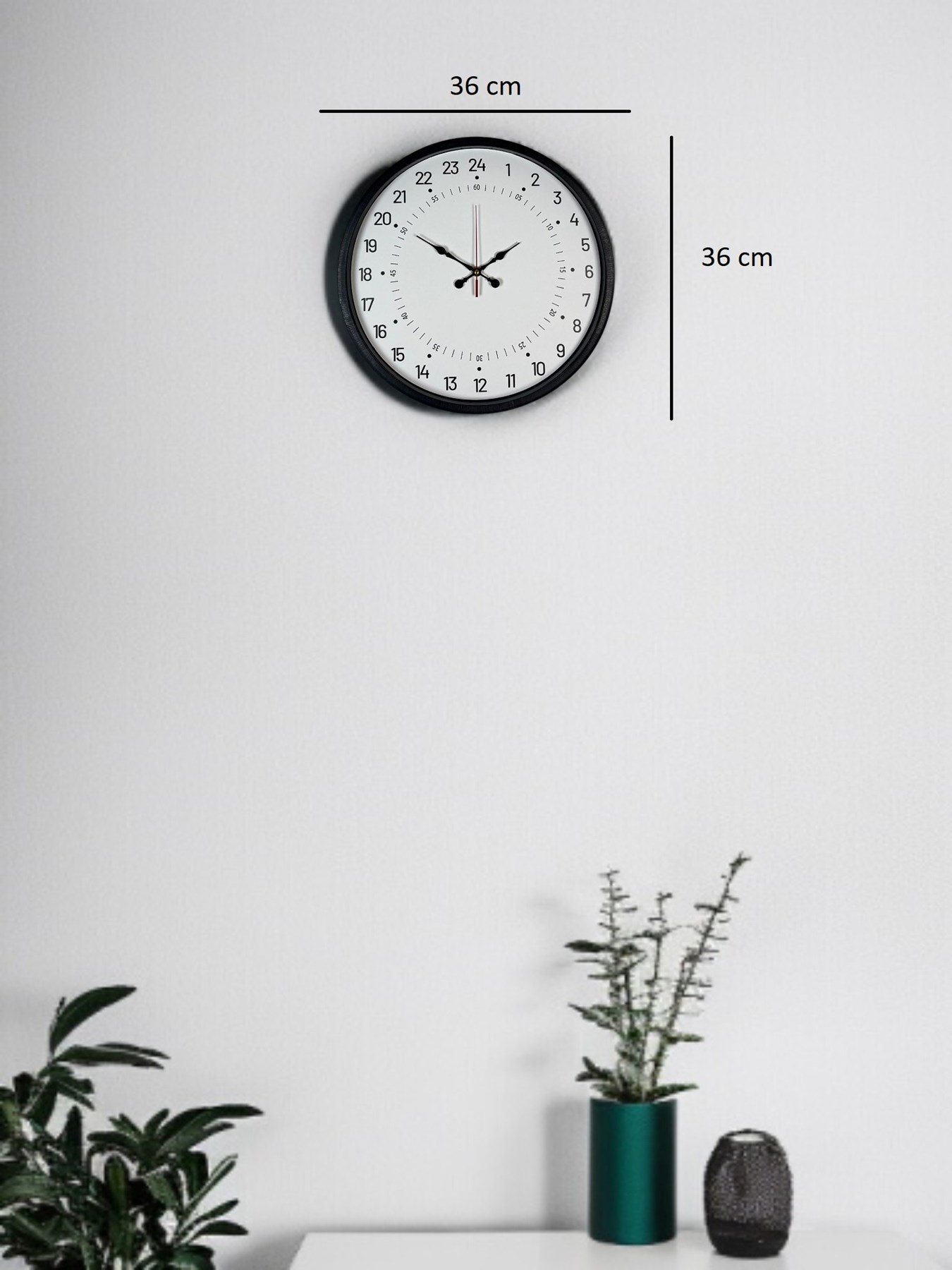 Standart 12 saatlik sistemden farklı olarak 24 saatlik zaman düzenine göre tasarlanan bu 36 cm siyah duvar saati, zamanı tek turda ve daha net bir şekilde takip etme imkânı sunar. Beyaz kadranı üzerinde yer alan 1–24 arası rakamlar sayesinde günün tüm saatleri kolayca ayırt edilir.
