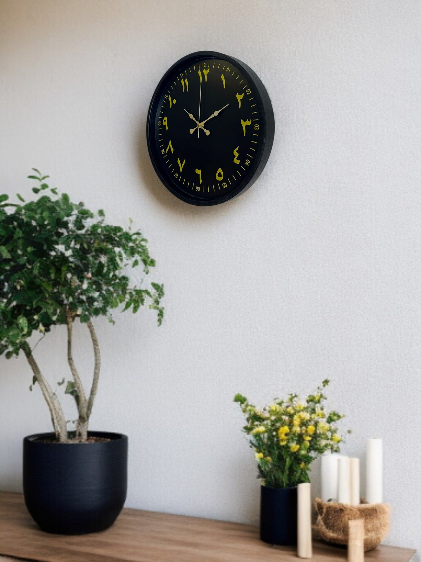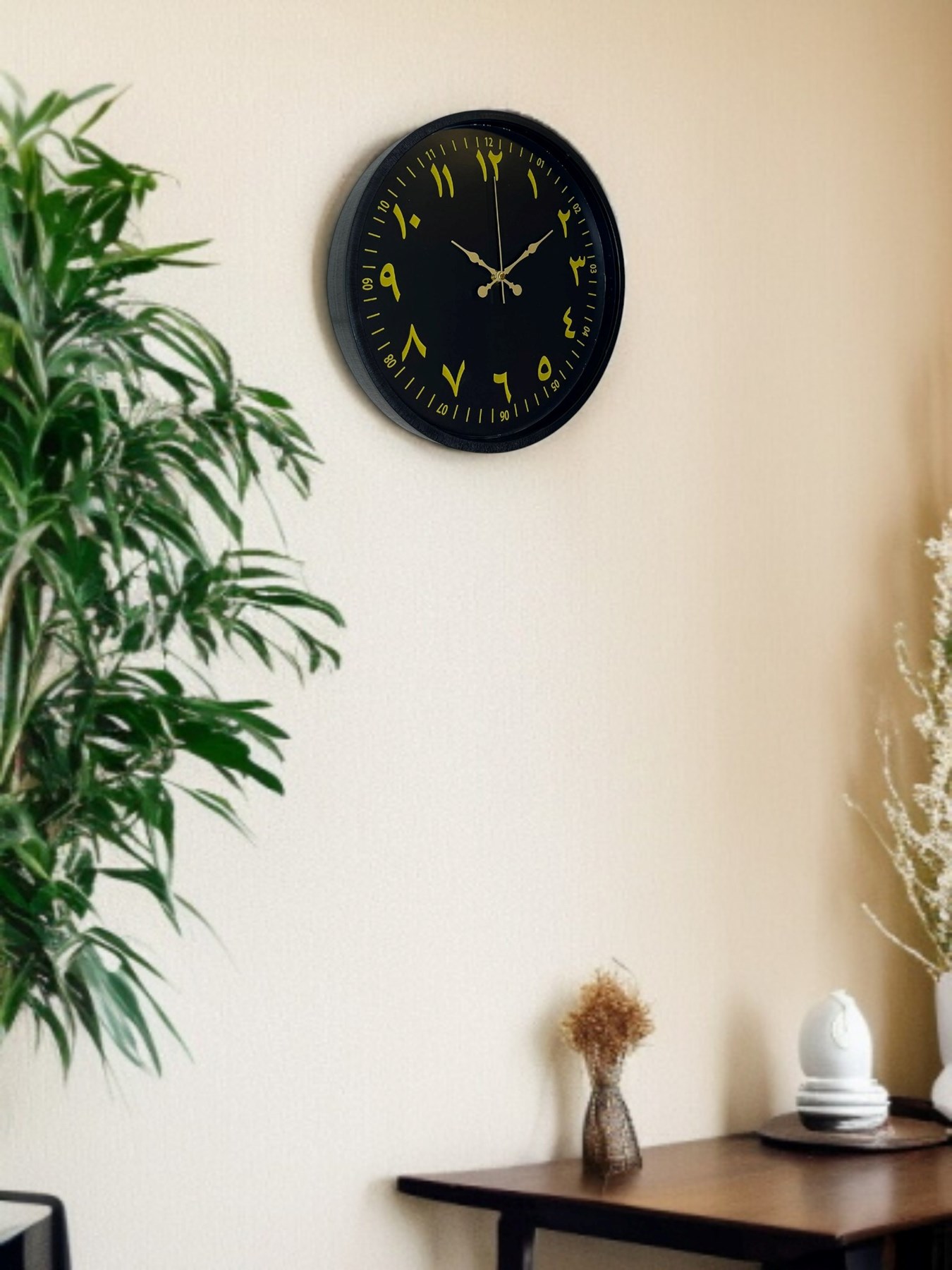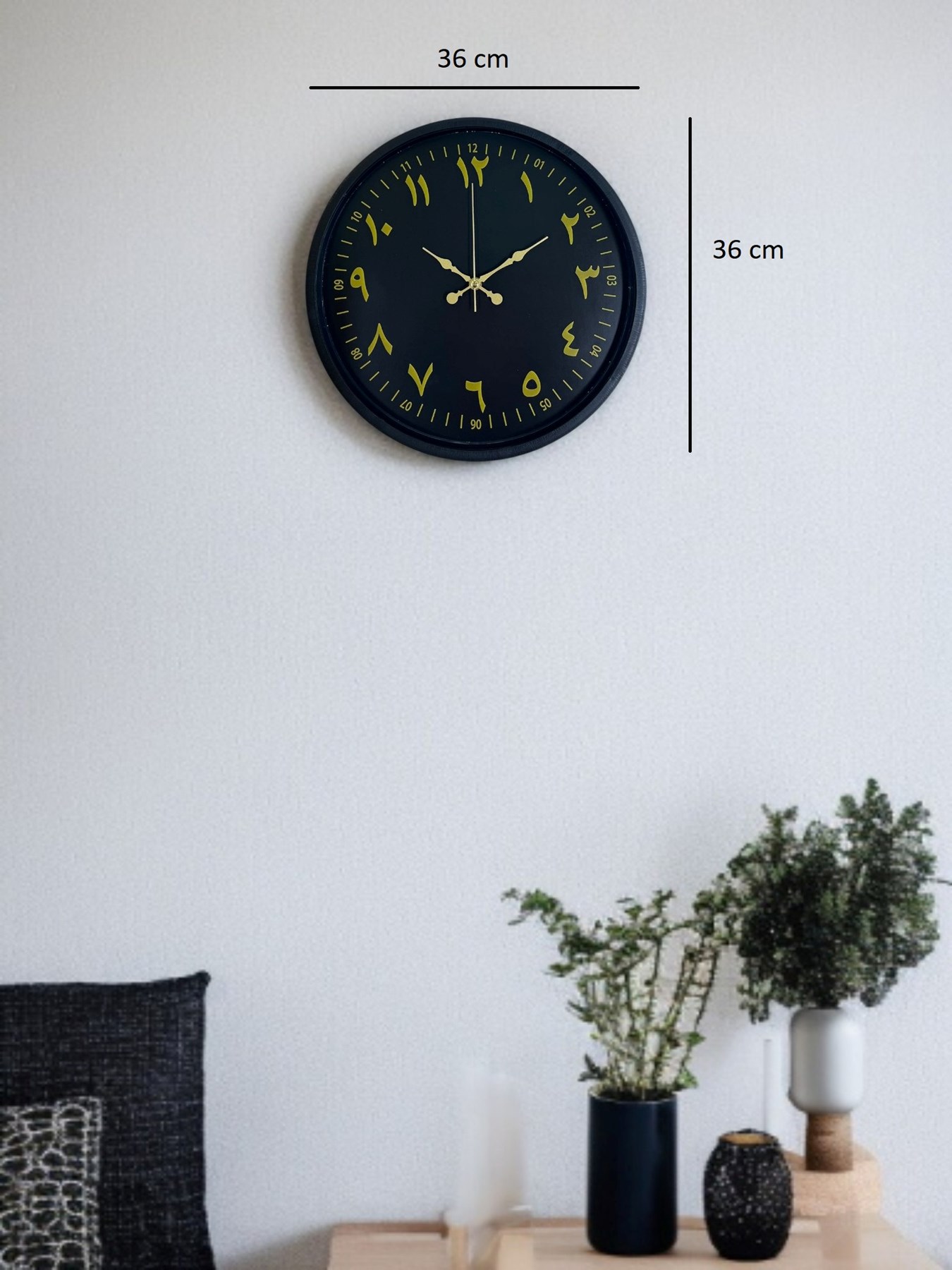 Siyah kadranı üzerinde yer alan gold tonlu Arapça rakamlarıyla öne çıkan bu 36 cm duvar saati, klasik saat anlayışını modern çizgilerle buluşturur. Arapça rakam tasarımı, saate farklı ve özgün bir karakter kazandırırken dekorasyona estetik bir dokunuş ekler.