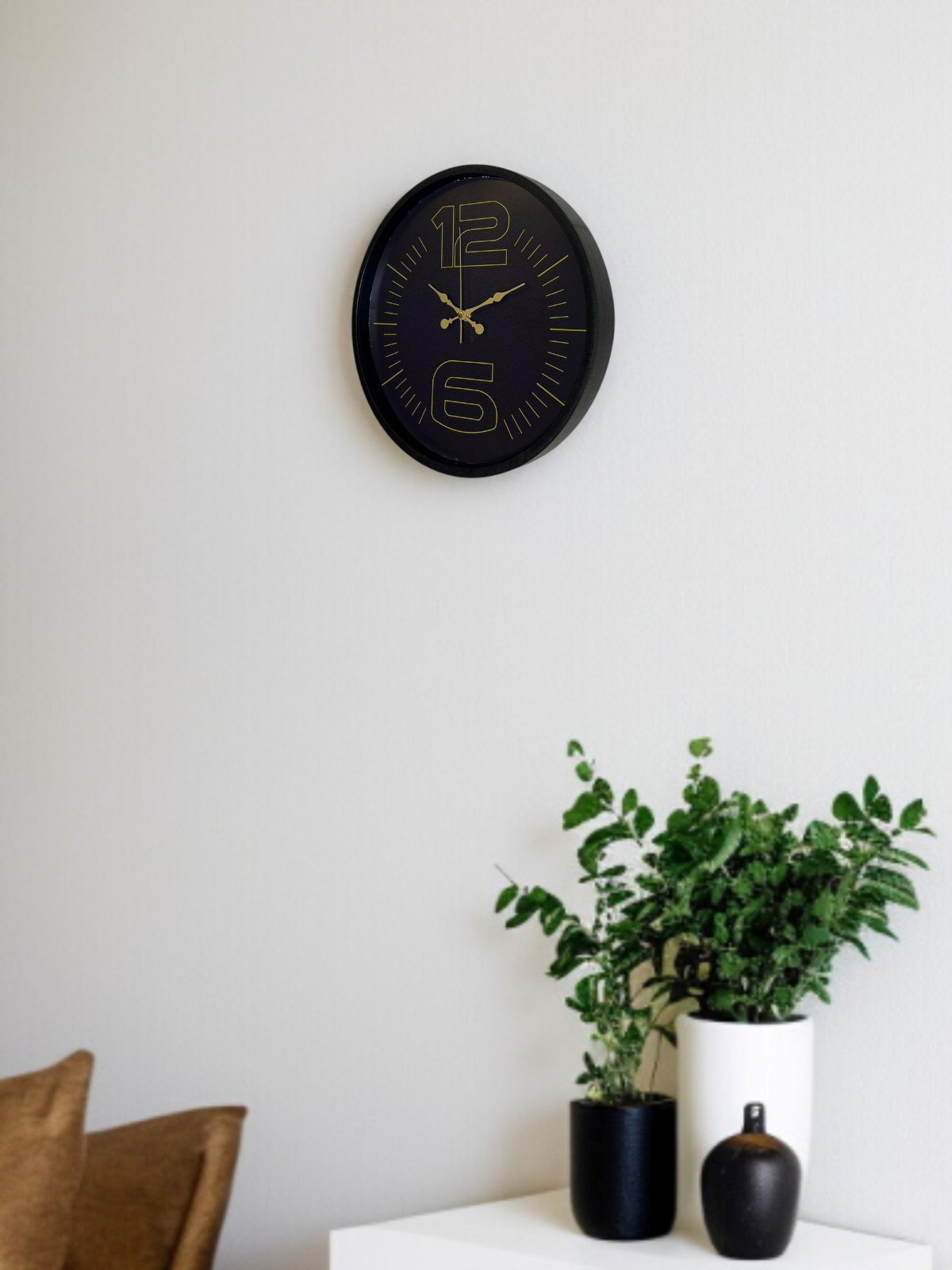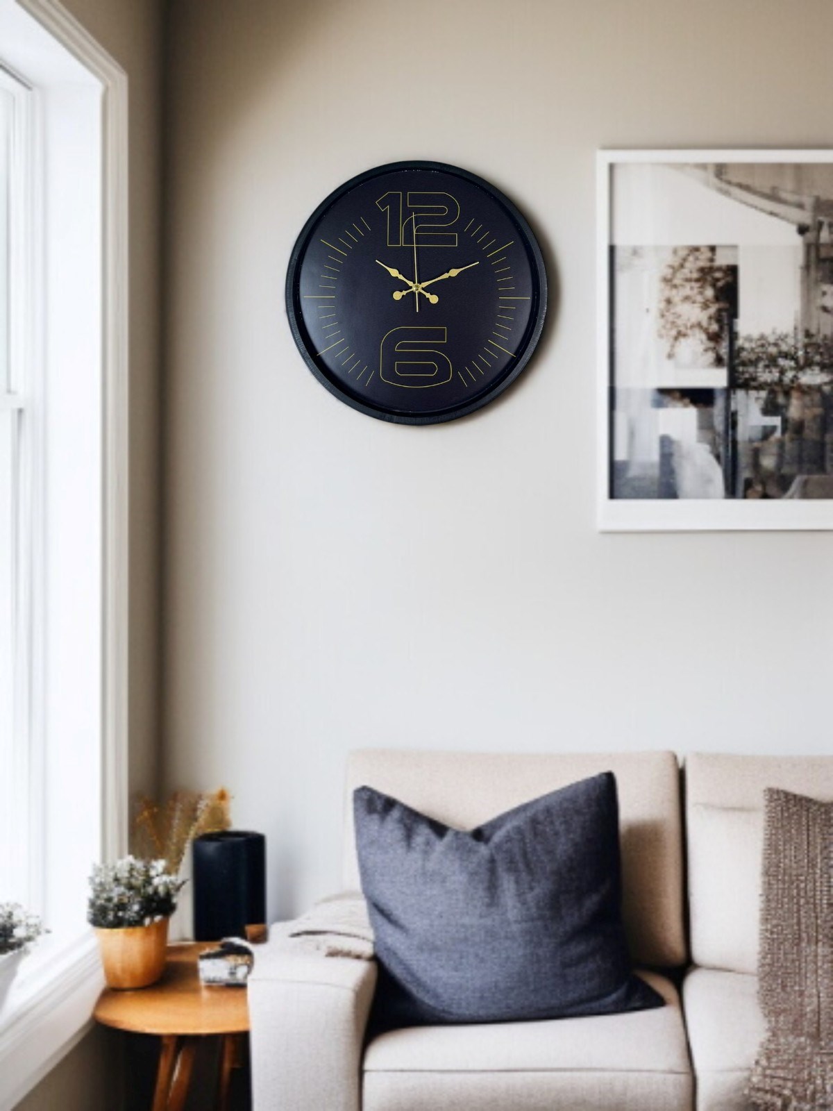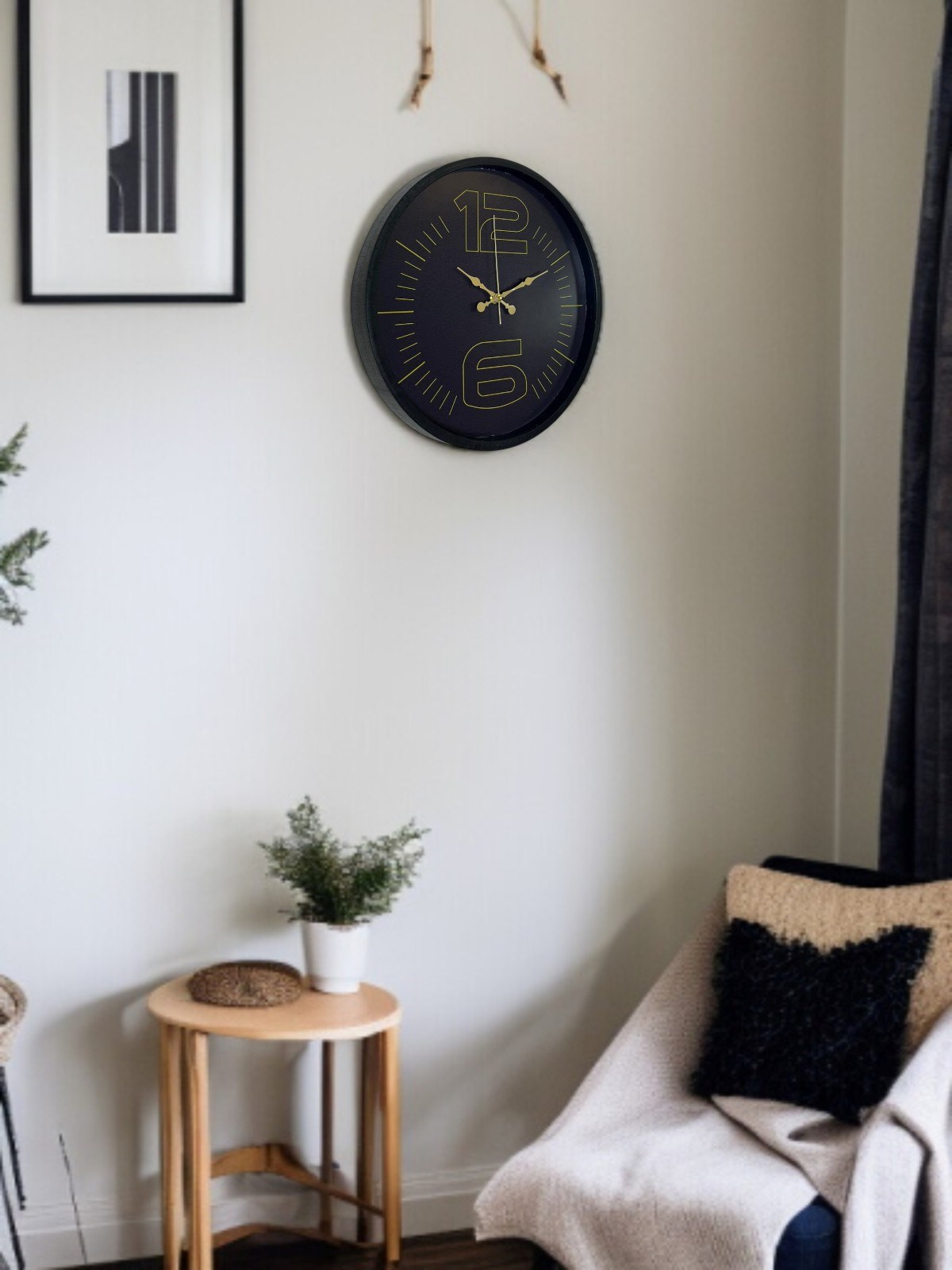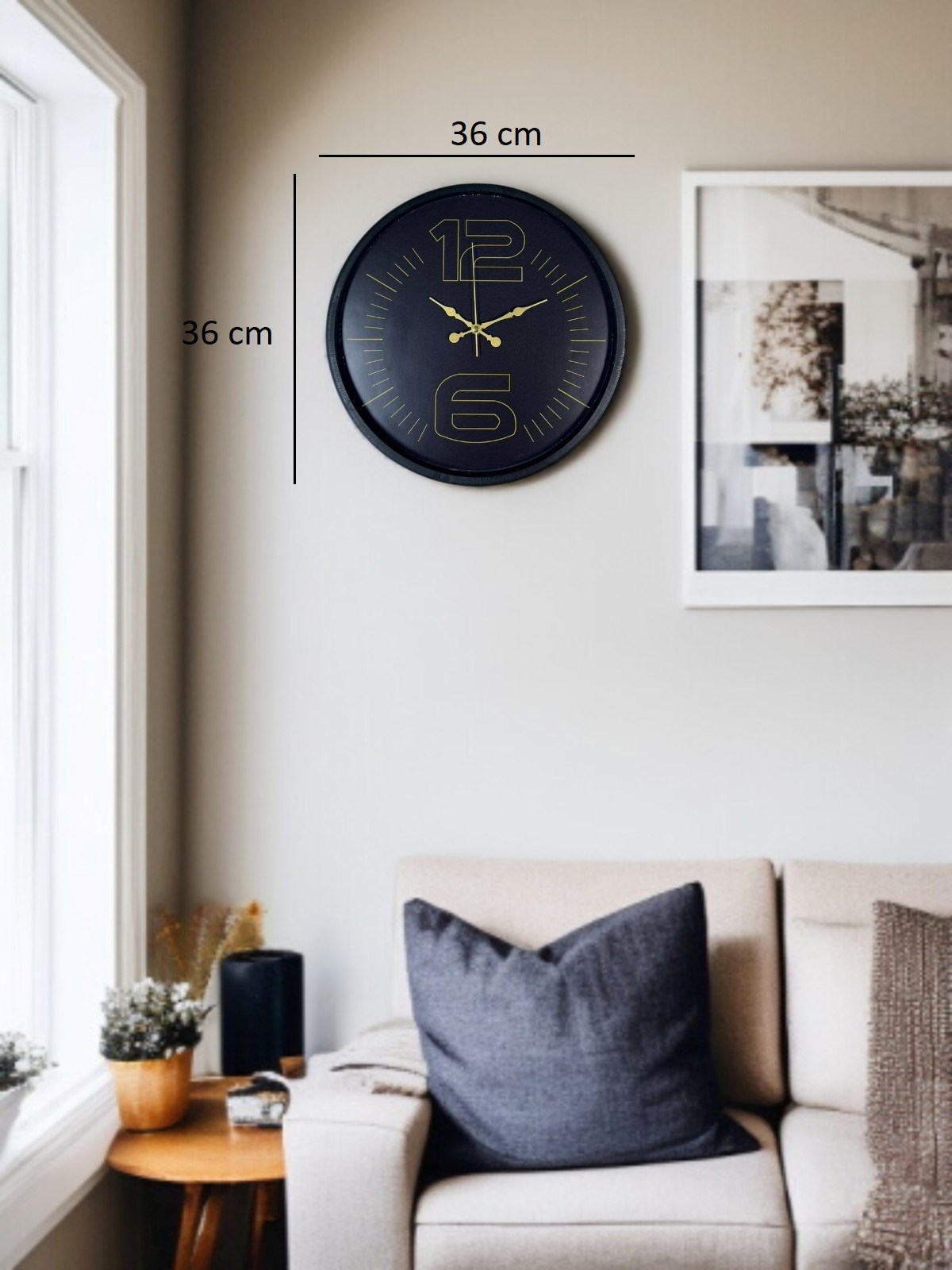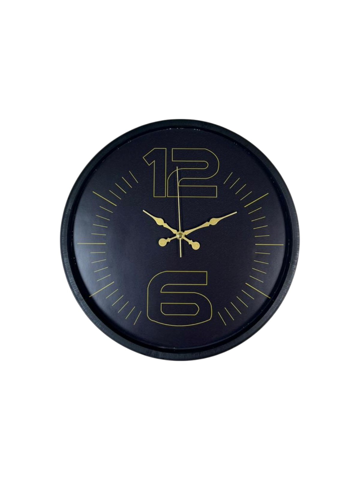 Mat siyah çerçevesi, koyu kadranı ve altın tonlu büyük “12” ve “6” rakam detayları ile tasarlanan bu 36 cm duvar saati; modern, şık ve iddialı bir duruş sergiler. Minimal ama karakterli tasarımı sayesinde bulunduğu ortama sofistike bir hava katar.