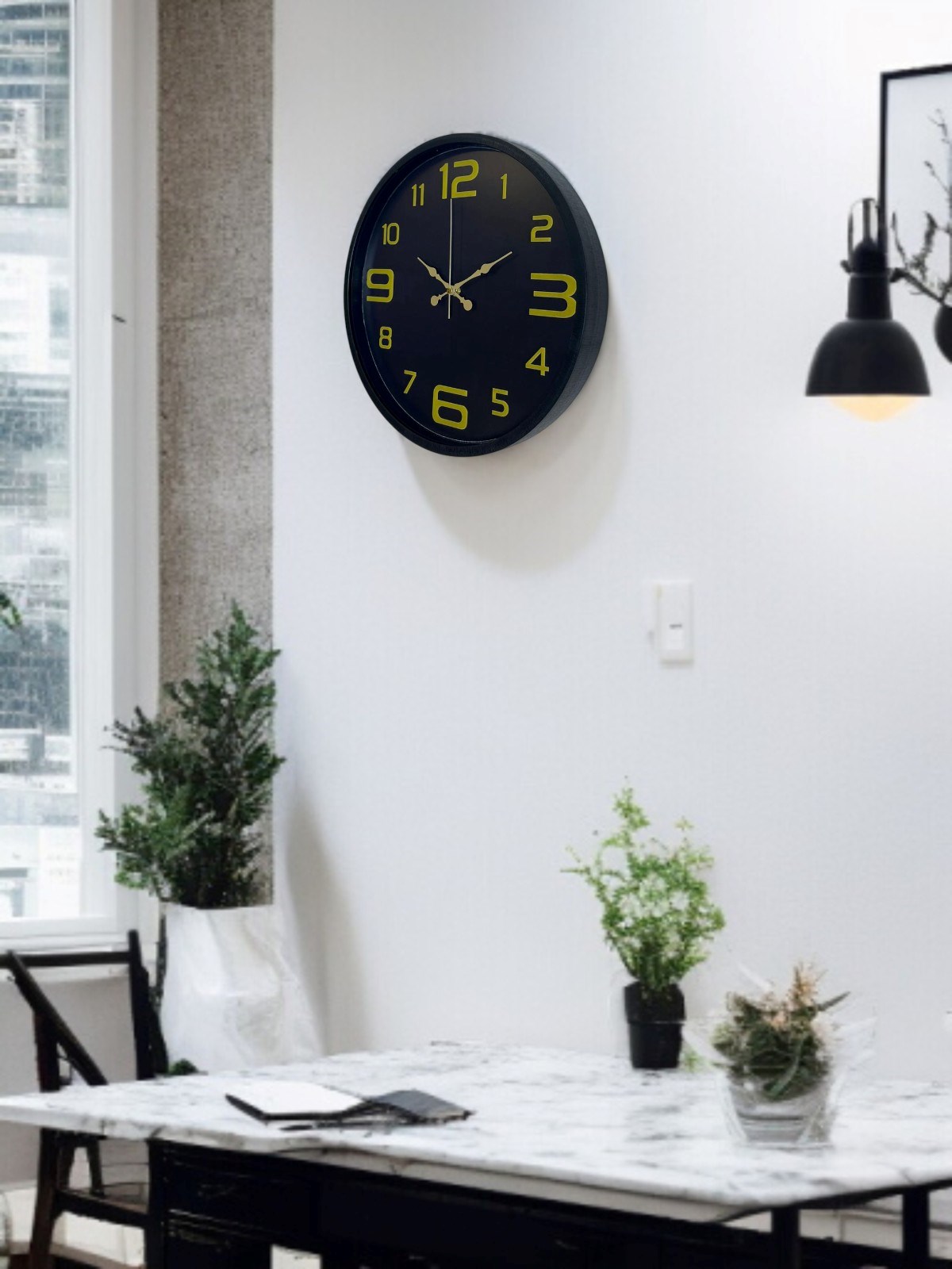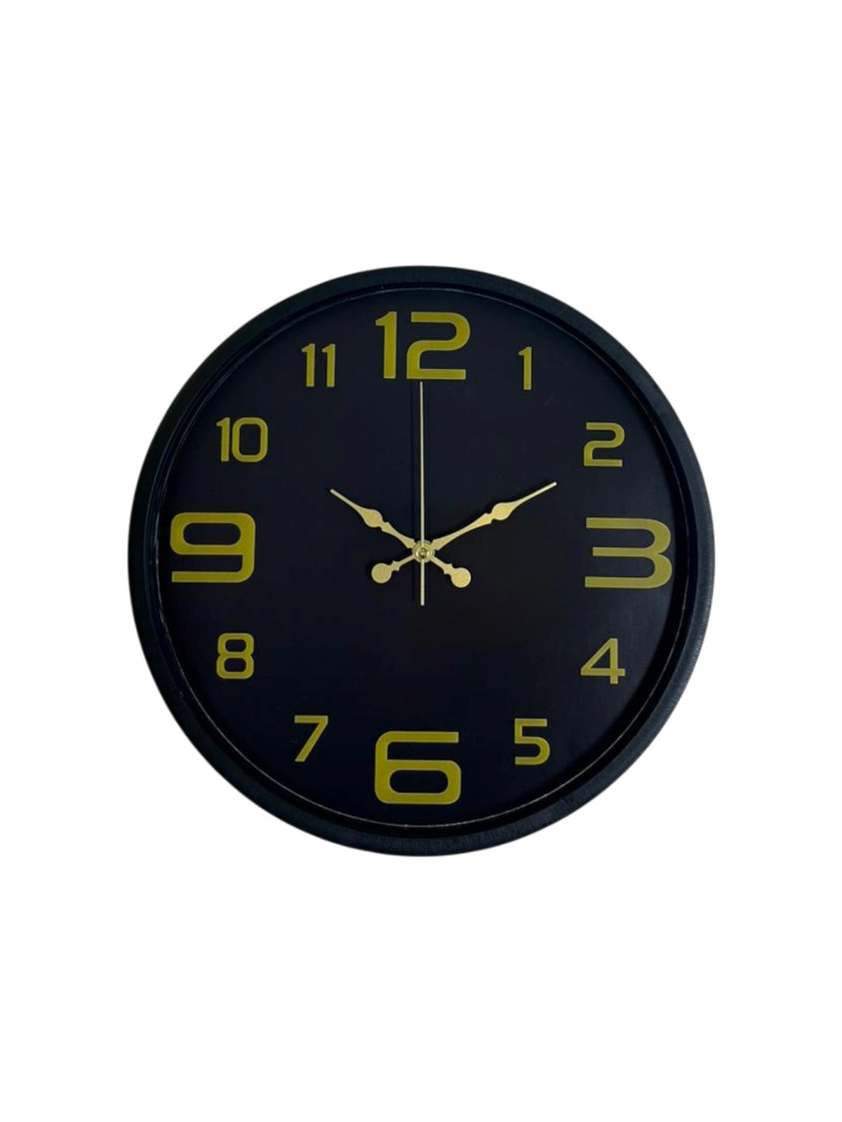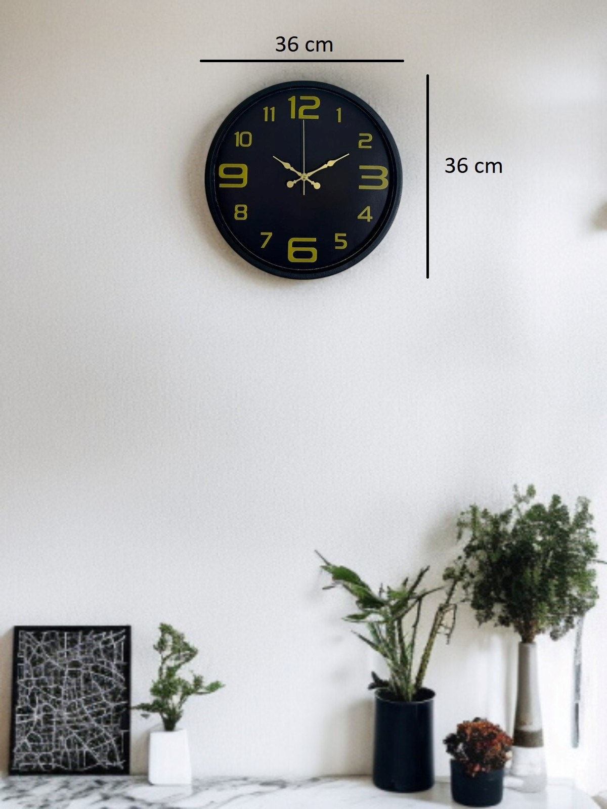Mat siyah çerçevesi ve koyu kadranı üzerinde yer alan altın tonlu rakamları ile tasarlanan bu 36 cm duvar saati, bulunduğu ortama güçlü ve sofistike bir karakter kazandırır. Yüksek kontrastlı tasarımı sayesinde saati uzaktan bile net şekilde okumak mümkündür.