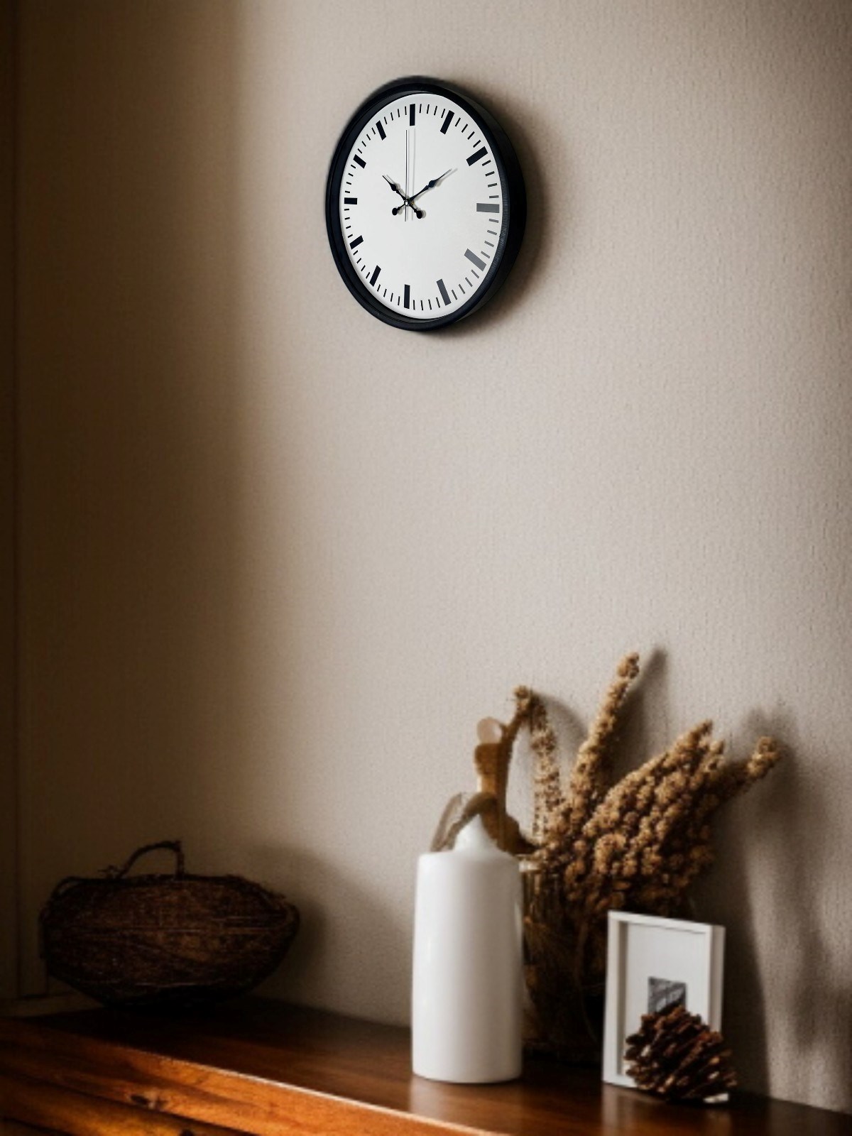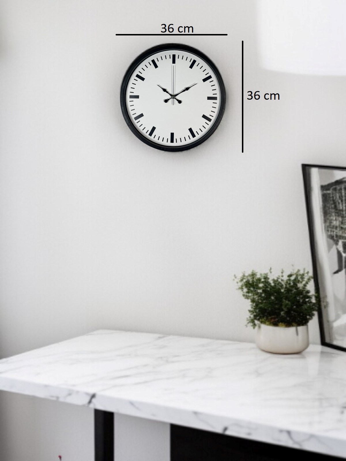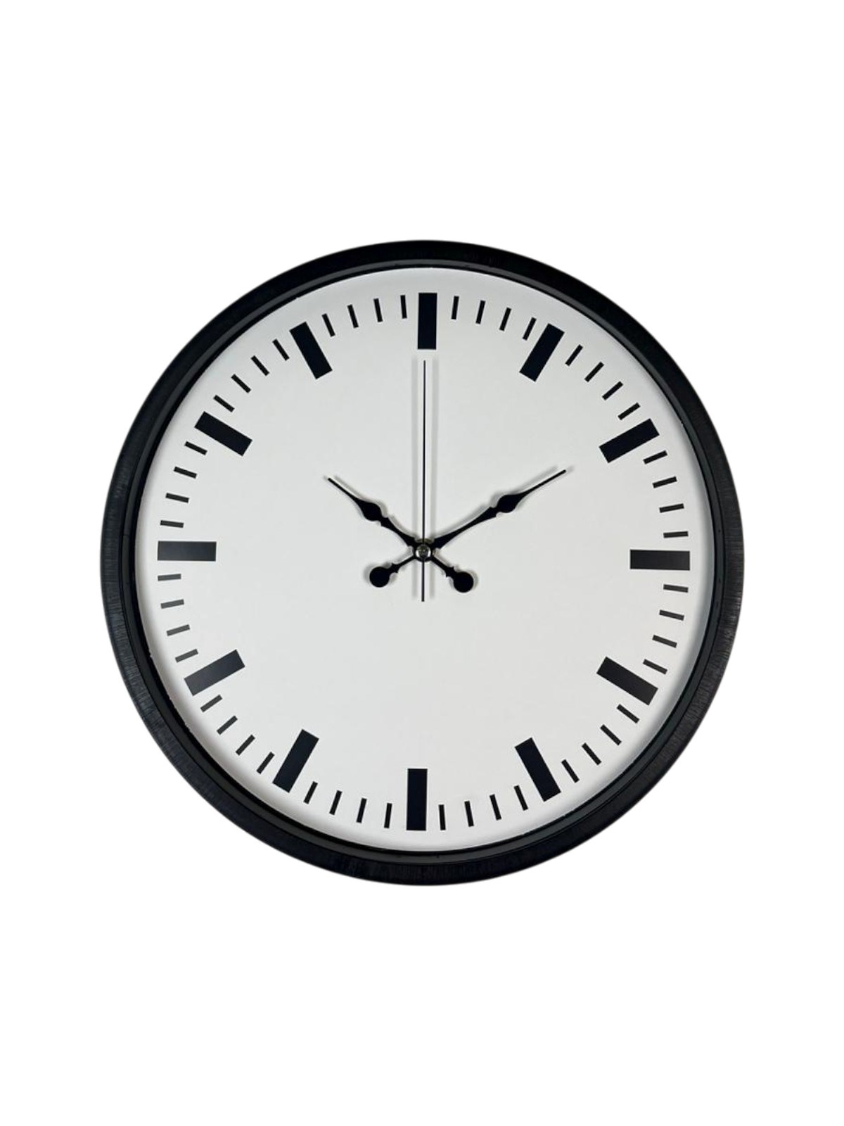 Beyaz kadranı ve siyah çizgi indeksleriyle güçlü bir kontrast sunan bu 36 cm duvar saati, sade ama dikkat çekici tasarımıyla modern yaşam alanlarına şıklık katar. Rakam kullanılmadan tasarlanan kadranı sayesinde minimalist bir duruş sergilerken, kalın saat işaretleriyle yüksek okunurluk sağlar.