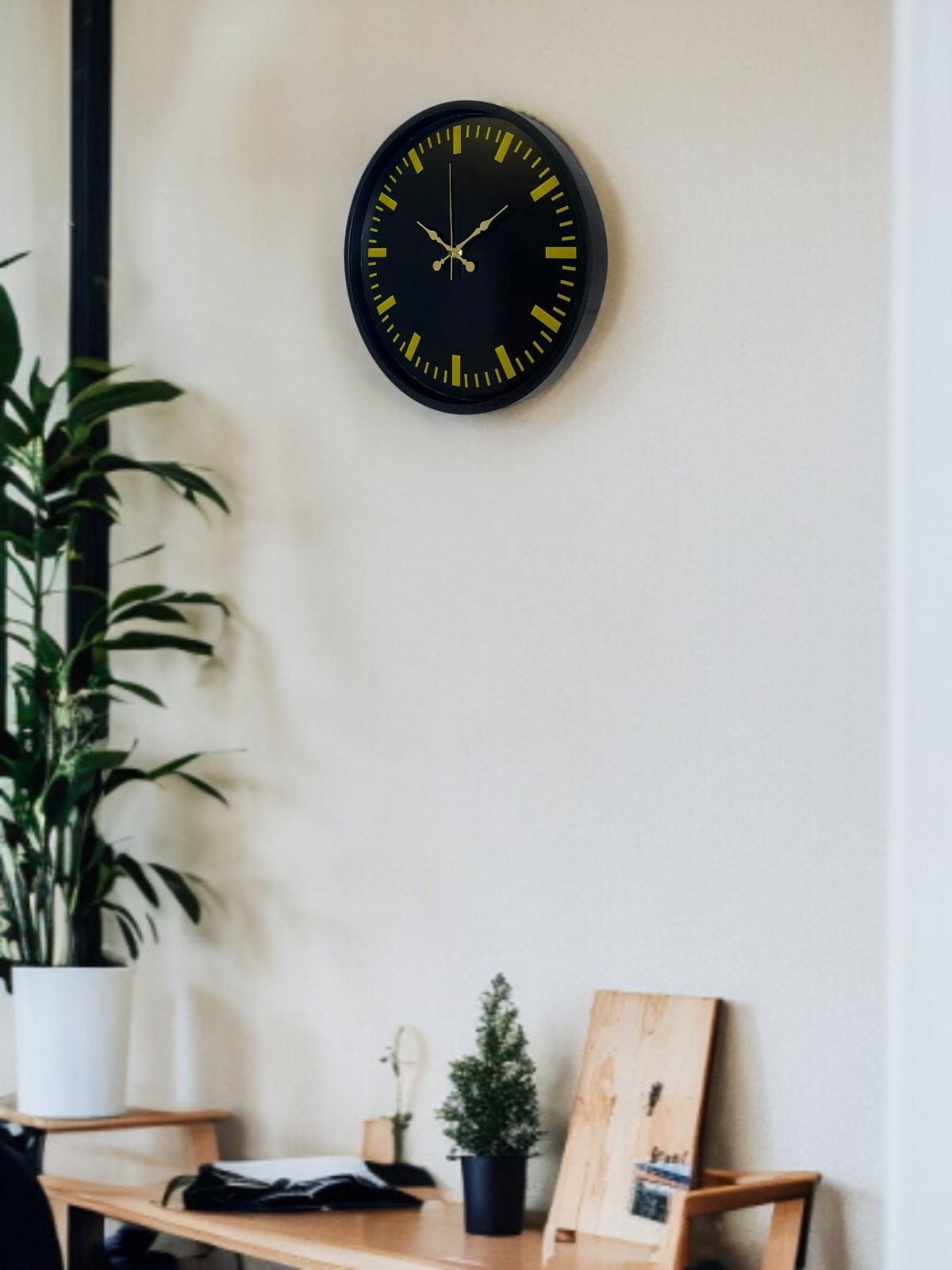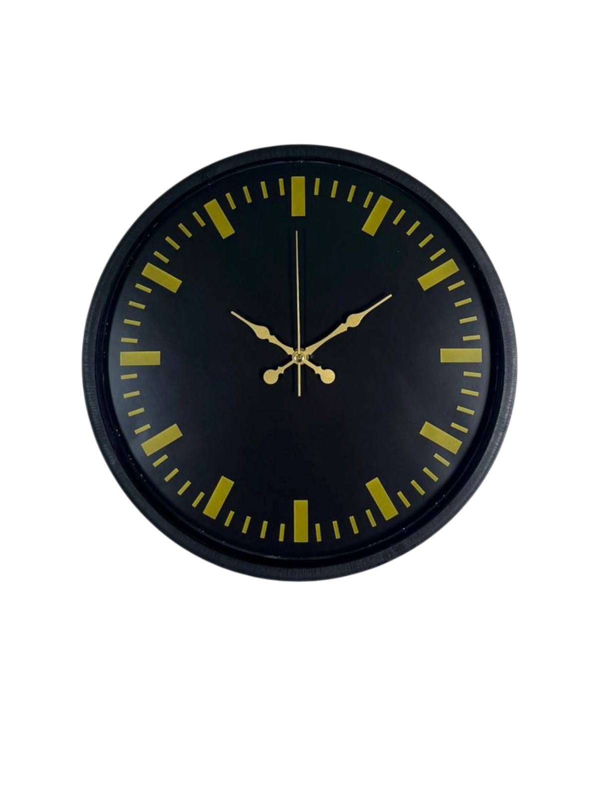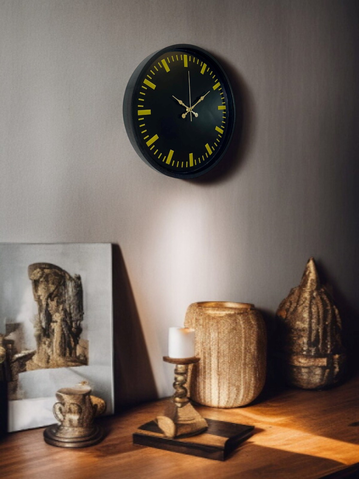 Rakam kullanılmadan tasarlanan çizgi indeksli kadranı ile bu 36 cm siyah duvar saati, modern dekorasyonun sade ve güçlü temsilcilerinden biridir. Mat siyah zemin üzerine yerleştirilen gold çizgi göstergeler, saatin okunurluğunu artırırken minimalist bir şıklık sunar.