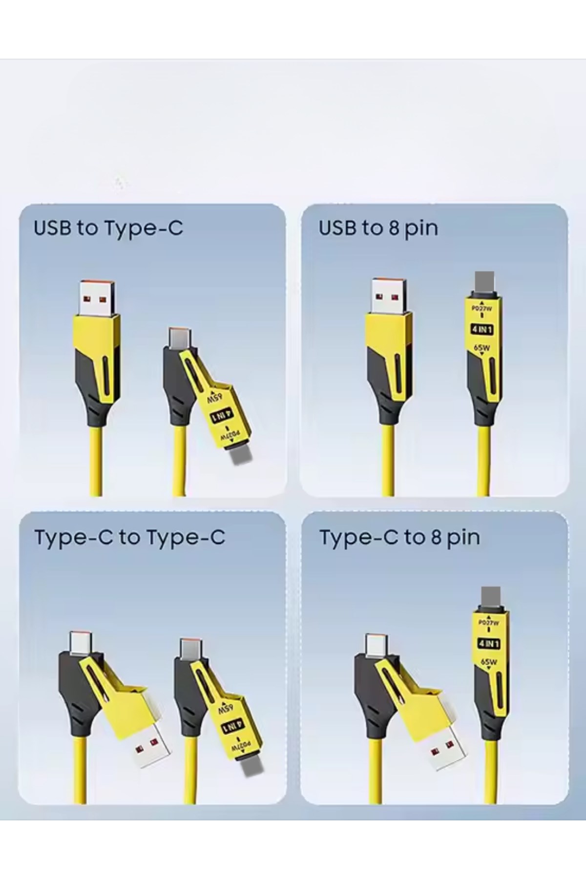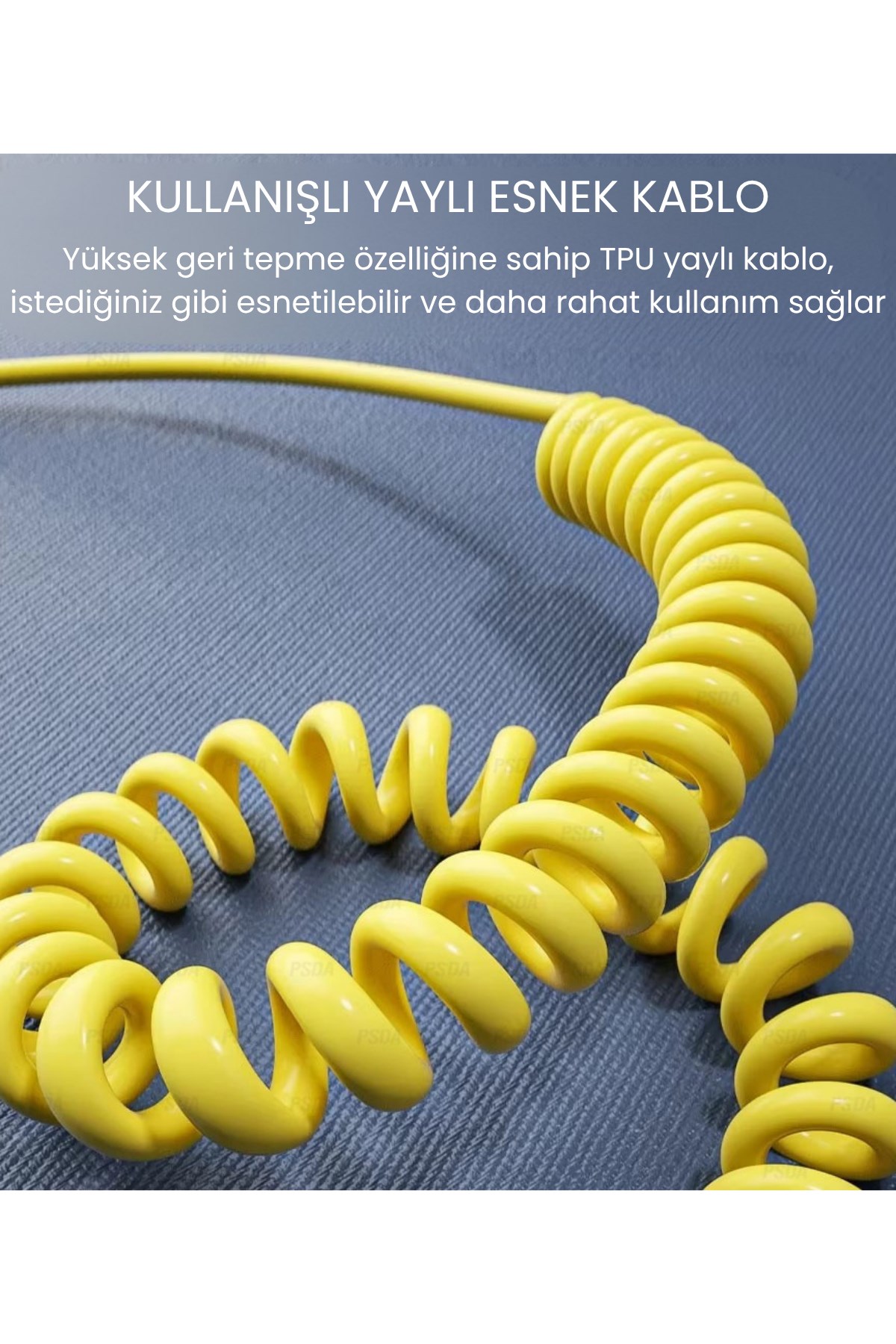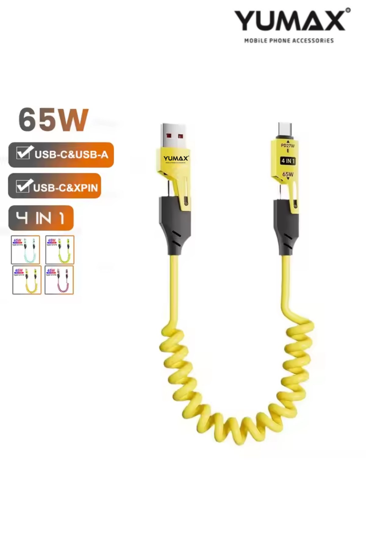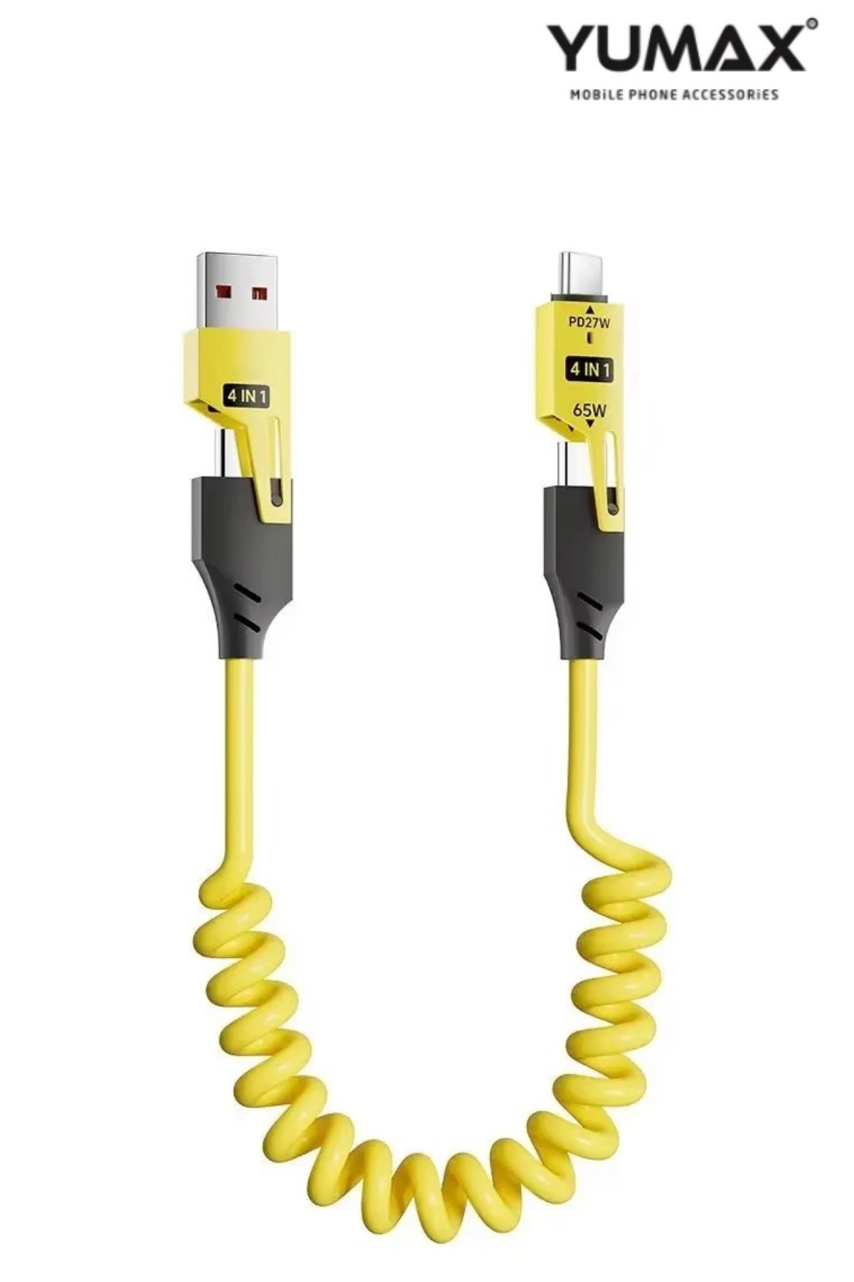 65W 4in1 Çoklu Şarj Kablosu, farklı cihazlarınızı tek bir kabloyla kolayca şarj etmenizi sağlar. Type-C, Lightning ve Mikro USB uçları sayesinde Android, iPhone ve diğer uyumlu cihazlarla geniş çapta kullanım imkanı sunar. Spiral yapısı sayesinde kablo karışıklığını önler ve kullanım sırasında esnekliği artırır.