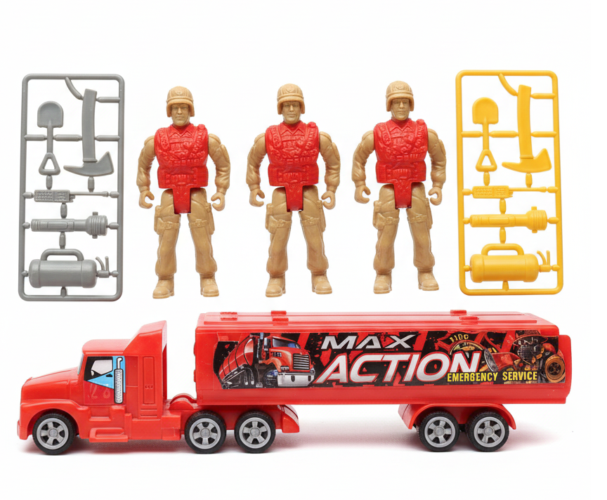 Max Action Acil Müdahale Tırı: Kırmızı gövdesi ve detaylı tasarımıyla dikkat çeker.