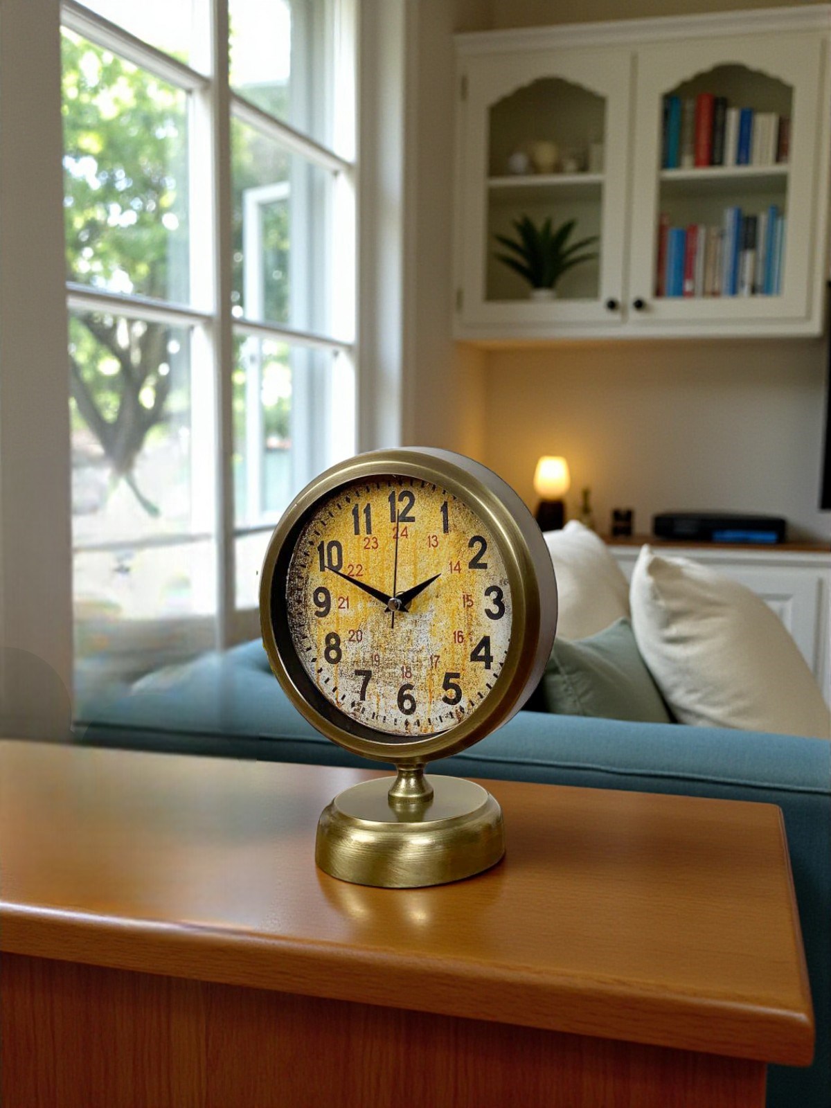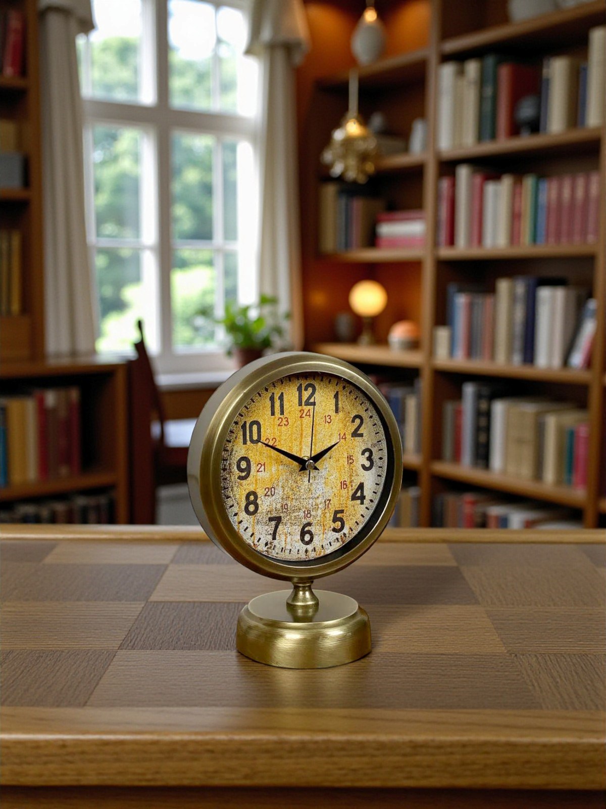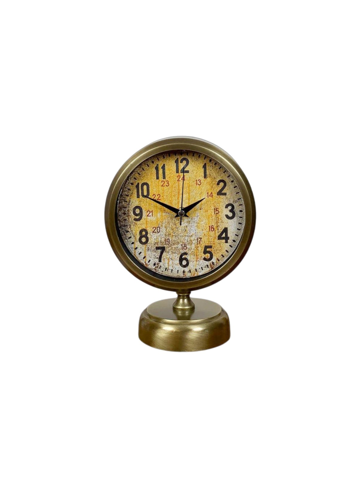 Kadran üzerinde yer alan 24 saat göstergesi, bu modeli standart masa saatlerinden ayıran en önemli özelliklerden biridir. Hem dekoratif hem de işlevsel olan bu detay, saate teknik ve koleksiyonluk bir hava kazandırır. Eskitme metal çerçevesi ve dengeli tabanı sayesinde sağlam bir duruş sergiler.