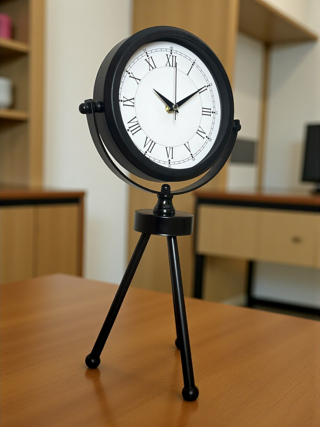 45 x 25 cm ölçülerindeki bu modern siyah üç ayaklı masa saati, minimal tasarımı ve güçlü duruşuyla her ortama şıklık katar. Gerçek cam korumalı kadranı sayesinde net görüntü ve uzun ömürlü kullanım sağlar. Tamamen metal gövdesi ve tripod ayak yapısıyla sağlam, dekoratif ve premium bir görünüm sunar. Sessiz akar saniye mekanizmasıyla ev, ofis ve çalışma alanlarında rahatsızlık vermeden kullanılabilir.
