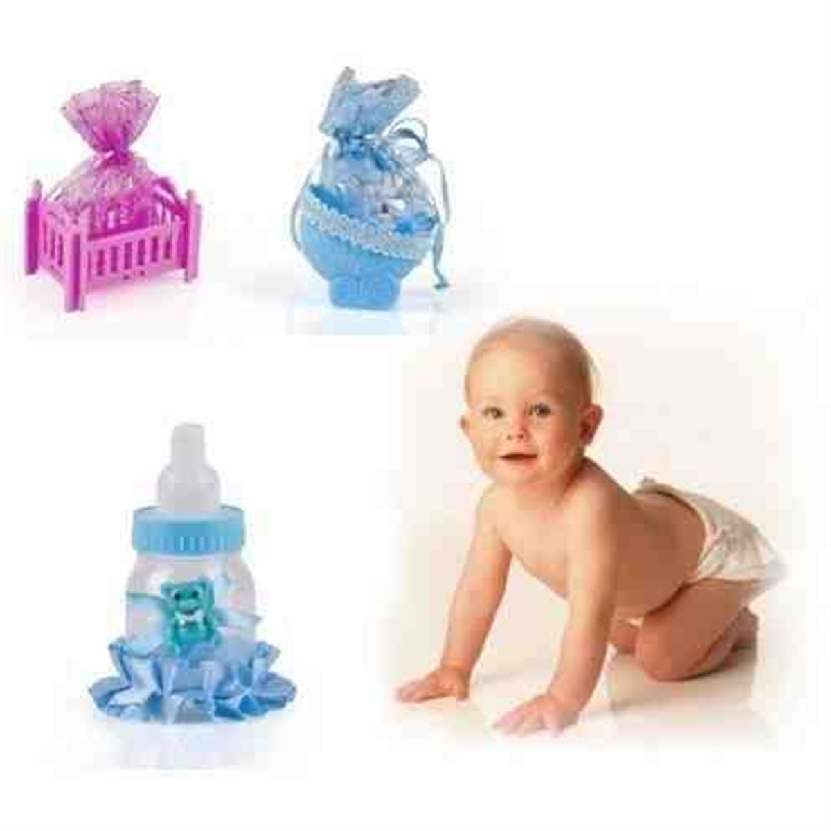 Beşik, bebek arabası ve biberon çeşitleri ile.