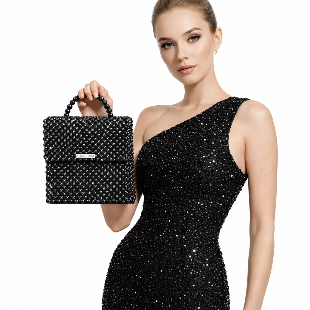 Çanta gövdesi, 8 mm standart yuvarlak kesim optik sınıfı kristal boncukların, yüksek dayanımlı monofilament misina kullanılarak yüksek yoğunluklu düz örgü tekniğiyle tek tek işlenmesi sonucu tamamen el işçiliğiyle oluşturulmuştur. Kristallerin sık ve homojen dizilimi, yüzey boyunca kesintisiz bir parlaklık sağlarken; örgü yapısı çantanın desteksiz şekilde formunu koruyabilen rijit bir yapı kazanmasını mümkün kılar.