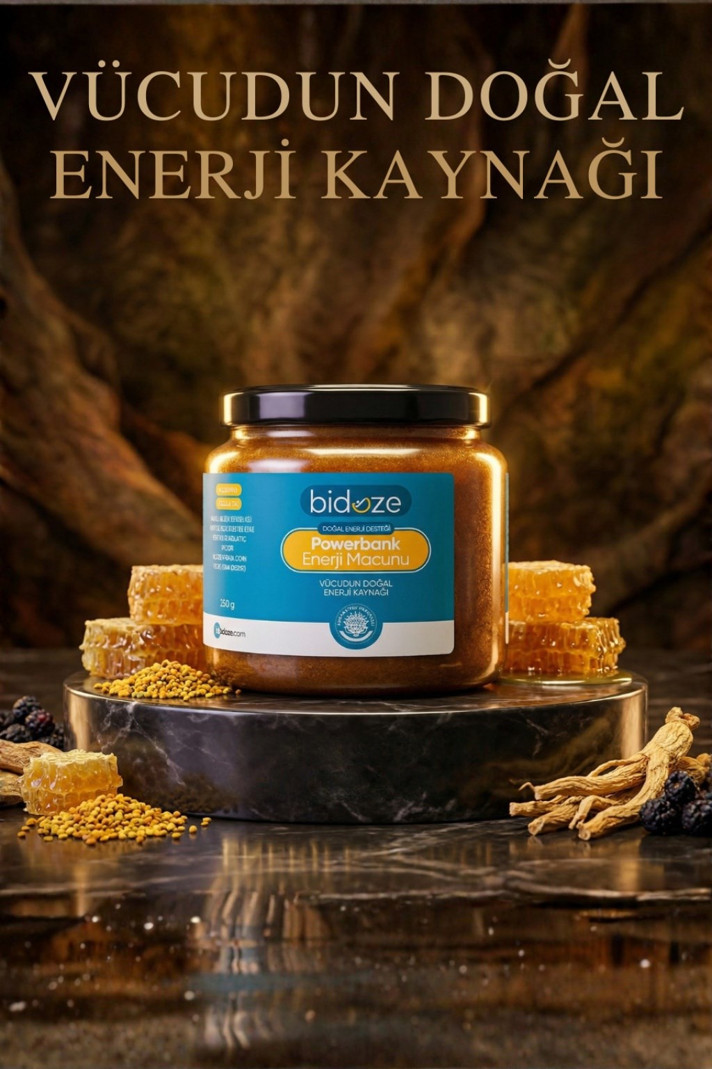 Bidoze Powerbank Enerji Macunu; doğanın en güçlü enerji kaynakları olan arı ürünleri ve şifalı bitkilerin, bilimsel normlarda eşsiz bir uyumla bir araya getirildiği %100 doğal bir gıda takviyesidir. İsminden de anlaşılacağı üzere, vücudunuzun ihtiyaç duyduğu enerjiyi depolar ve gün boyu zinde kalmanızı sağlar.