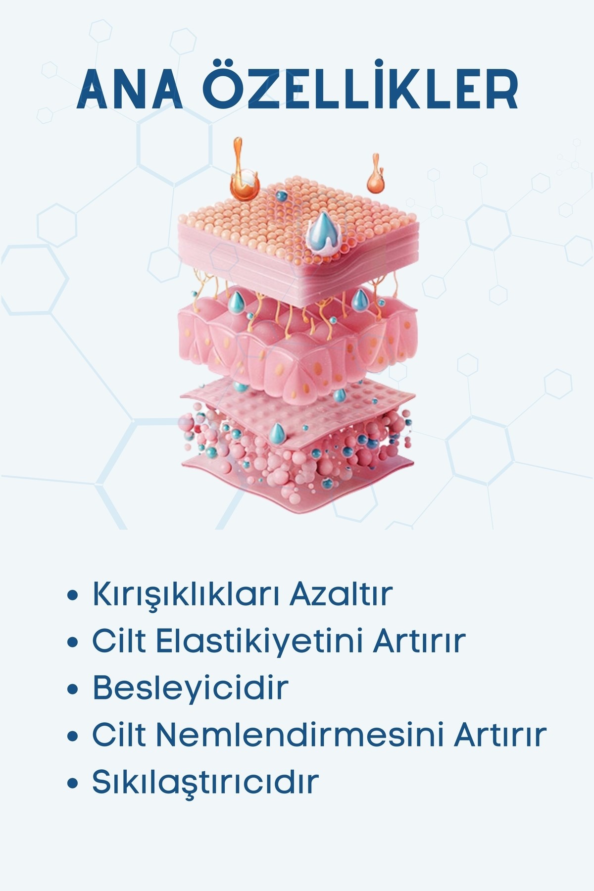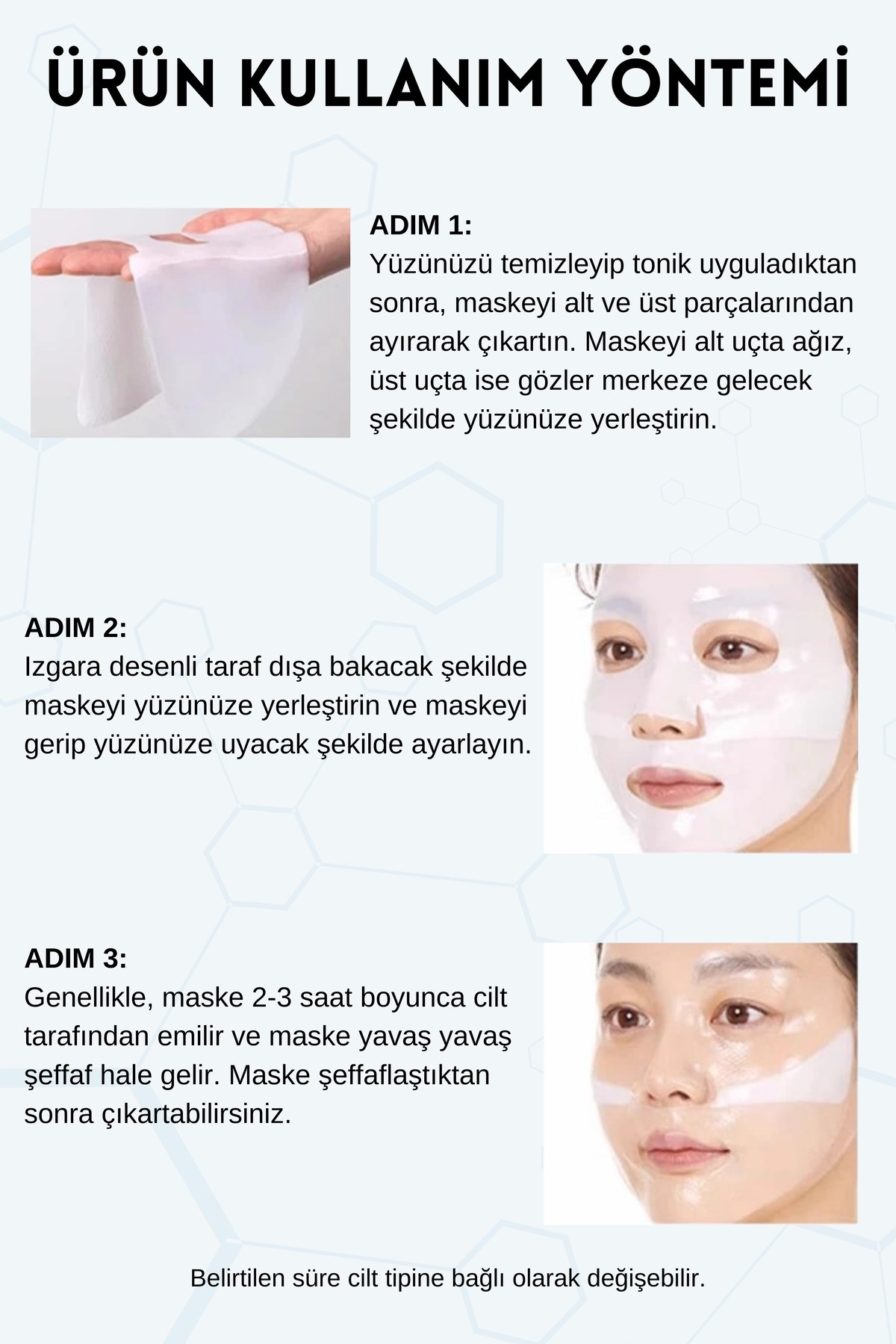 Kore güzellik ritüelinin vazgeçilmezi olan Deep Collagen HA Vitamin B5 Hydrating Mask, cildinize derinlemesine nemlendirme sağlar. . İçeriğindeki hyaluronik asit, cildin nem seviyesini artırarak dolgun bir görünüm kazandırır. Ciltteki kuruluk ve ince çizgilerle savaşarak, taze ve canlı bir görünüm elde etmenize yardımcı olur. Özellikle yüz temizleme, yüz maskesive hidratasyonarayanlar için idealdir. Bu maske, cildinizin doğal ışıltısını ortaya çıkarır ve sağlıklı bir görünüm kazandırır.Kullanma Talimatı:Yüzünüzü temizleyin ve kurulayın.Maskeyi ambalajından çıkarın ve yüzünüze dikkatlice yerleştirin.Maske yüzünüzde 3-4 saat bekletin veya en iyi sonuçlar için gece boyunca bırakın.Maskeyi çıkardıktan sonra, kalan serumu cildinize nazikçe masaj yaparak yedirin.Haftada 2-3 kez kullanarak en iyi sonuçları elde edebilirsiniz.14 yaş ve üzeri tüm cilt tiplerine uygundur.Uyarılar:Sadece harici kullanım içindir.Ciltte tahriş veya alerjik reaksiyon belirtisi görülürse kullanmayı bırakın.Çocukların ulaşamayacağı bir yerde saklayın.Doğrudan güneş ışığından koruyun ve serin, kuru bir yerde muhafaza edin.