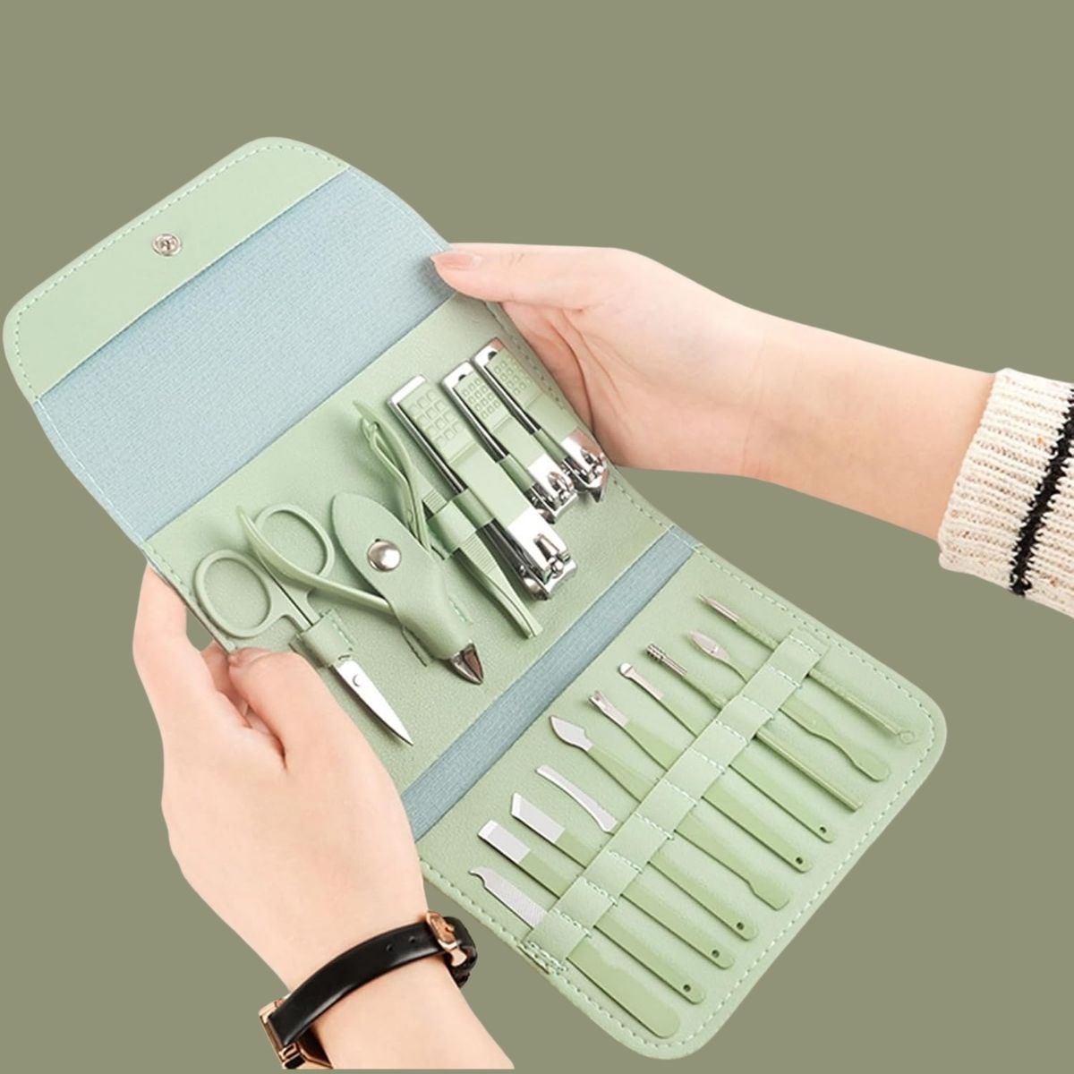 16 farklı parça ile kapsamlı bakım: Tırnak makası, törpü, cımbız, makas, tırnak temizleme aparatı ve daha fazlası