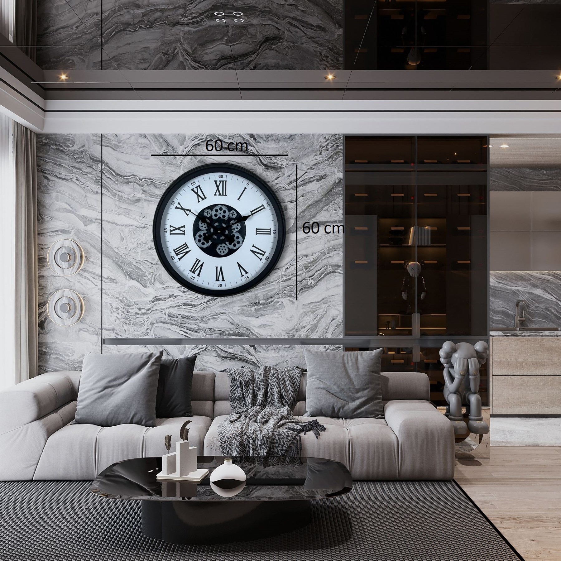 Klasik Roma rakamları ve modern mekanik çark tasarımının birleşimiyle tasarlanan bu 60 cm siyah duvar saati, bulunduğu ortama zamansız ve güçlü bir karakter kazandırır.