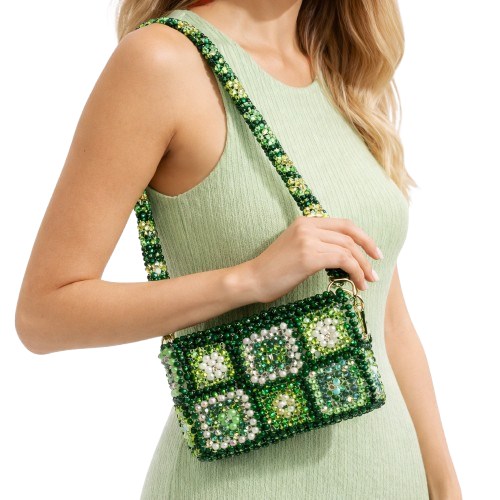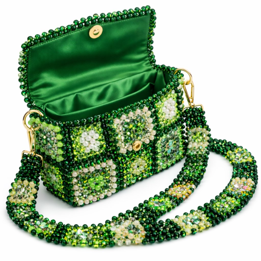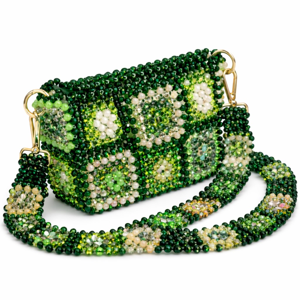 Atelier Emine’in Crystal Gelato Couture koleksiyonuna ait Budino Verdelune, 8 mm optik sınıfı çok yüzeyli kristal boncukların yüksek dayanımlı misina ile tek tek örülmesiyle tamamen el işçiliğiyle üretilmiş, modüler yüzey kurgusuna sahip premium mini omuz çantası modelidir.