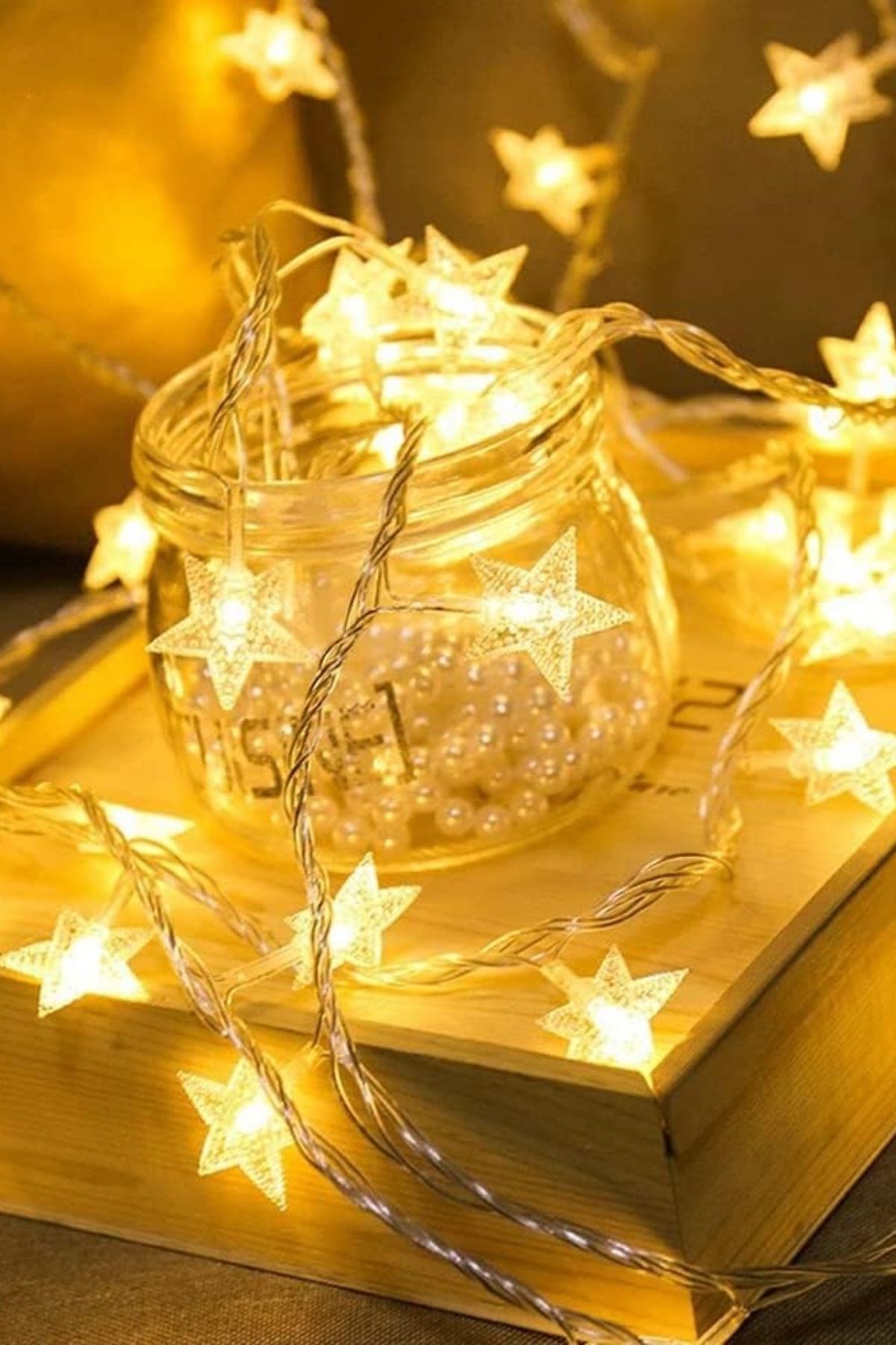 Dekoratif Aydınlatma: Yıldız şekilli 20 LED ampul, 5 metre uzunluğunda kablo üzerinde eşit aralıklarla dizilmiştir.