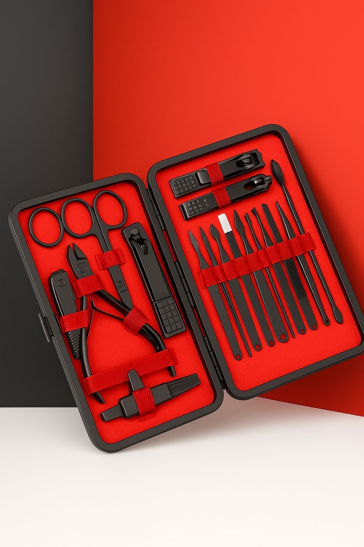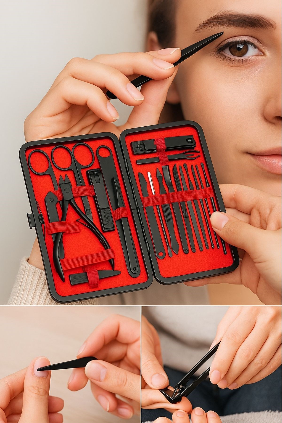 24 Parça Çok Amaçlı İçerik: Tırnak makası, törpü, cımbız, makas, kulak temizleyici, sivilce çıkarıcı, tırnak eti aparatı ve daha fazlası.