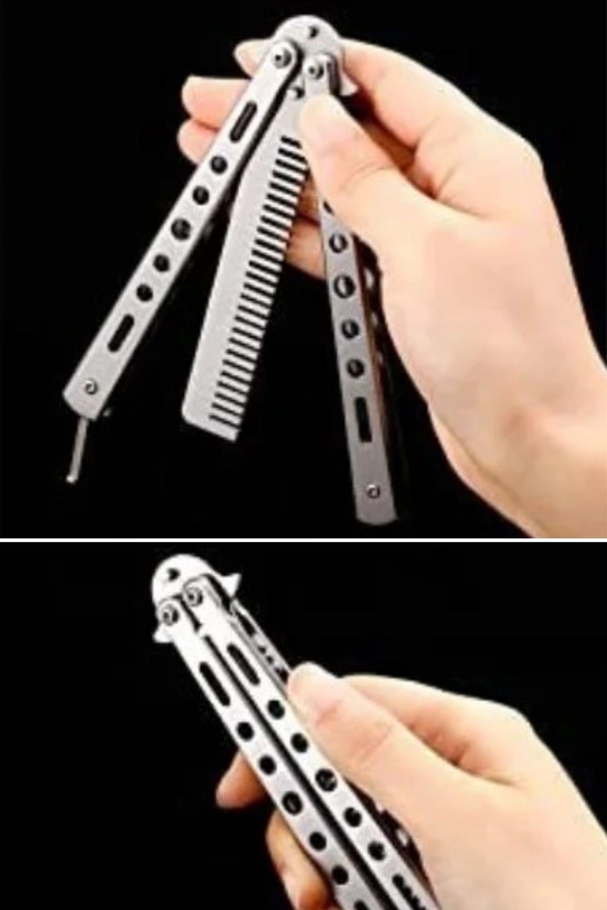 Biyomak® Gri Katlanabilir Paslanmaz Çelik Kelebek Bıçak Tarak – Sakal & Bıyık Fırçası, Profesyonel Saç Kesimi İçin Tarak