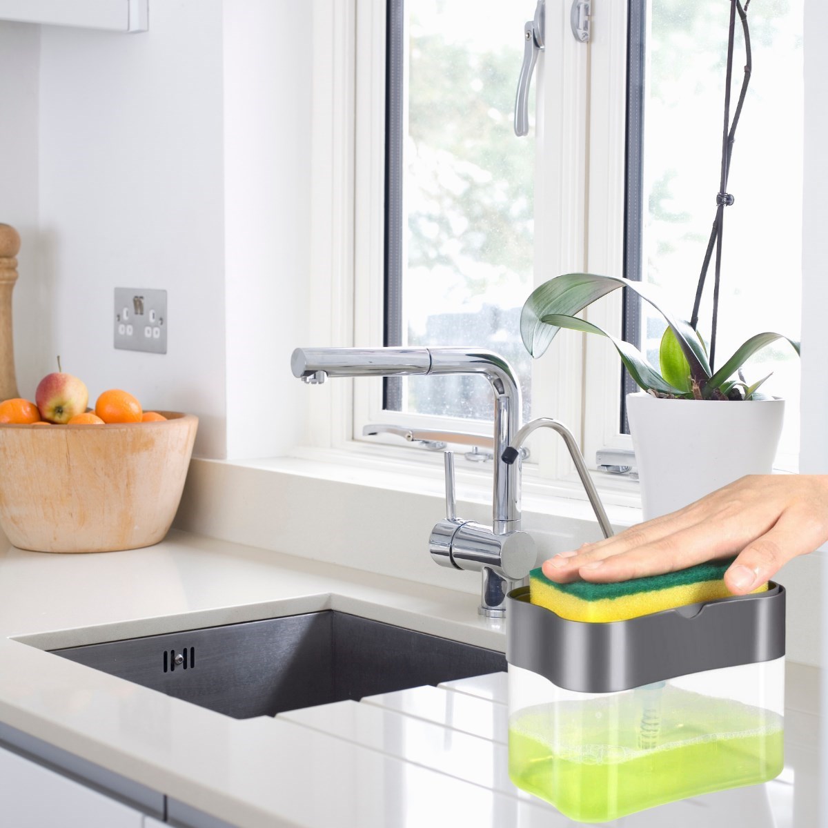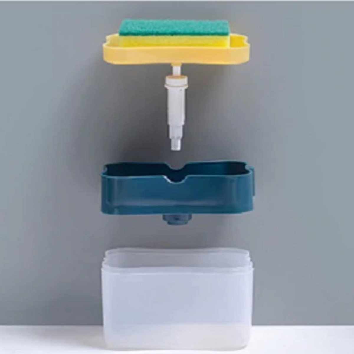 <>Biyomak® İkisi Bir Arada Basmalı Pratik Sıvı Sabunluk Pompası ve Bulaşık Yıkama Süngeri Haznesi