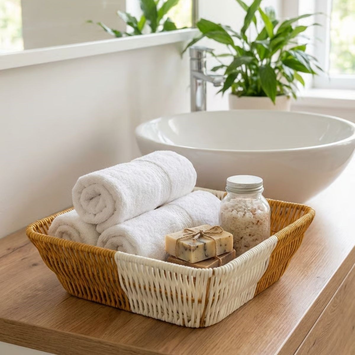Dayanıklı plastik rattan malzemeden üretilen sepet, hafif ve kırılmaya karşı dirençlidir. Yıkanabilir ve nemli ortamlara uygun yapısı sayesinde hijyenik, pratik ve uzun ömürlü kullanım sunar. Kare formu ile alanı verimli kullanmanıza yardımcı olur.