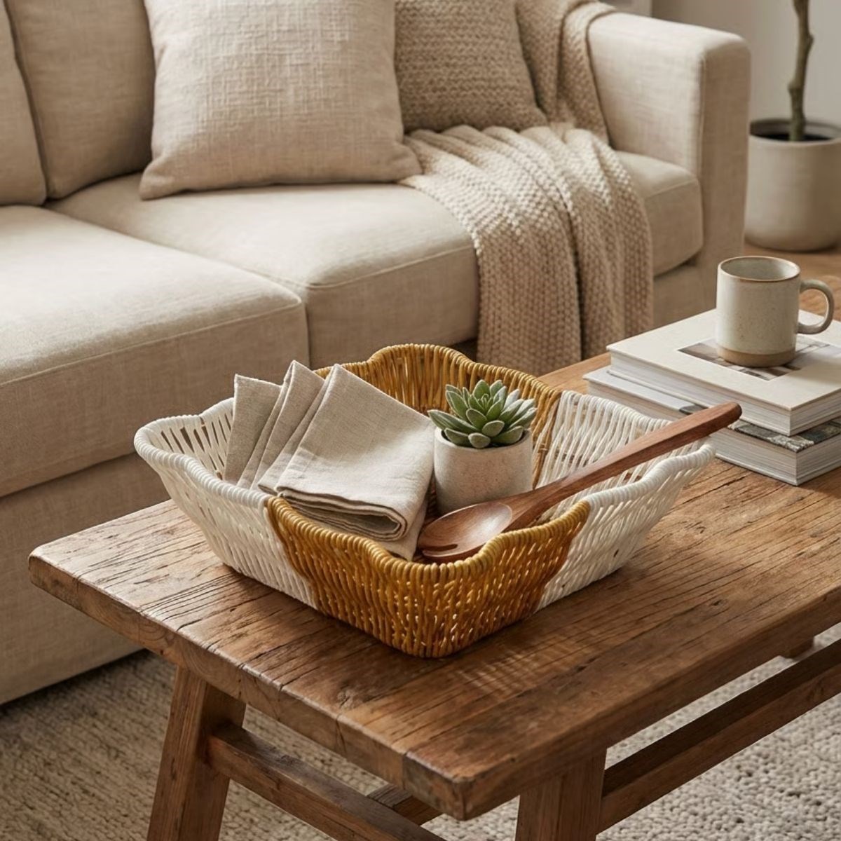 Biyomak® Kare Dalgalı Çift Renkli Plastik Rattan Sepet, modern tasarımı ve fonksiyonel yapısıyla evinizin her alanında düzen ve şıklığı bir arada sunar. Dalgalı kenar formu ve çift renkli hasır görünümlü dokusu sayesinde mutfak, banyo ve yaşam alanlarında dekoratif bir tamamlayıcı olarak öne çıkar.