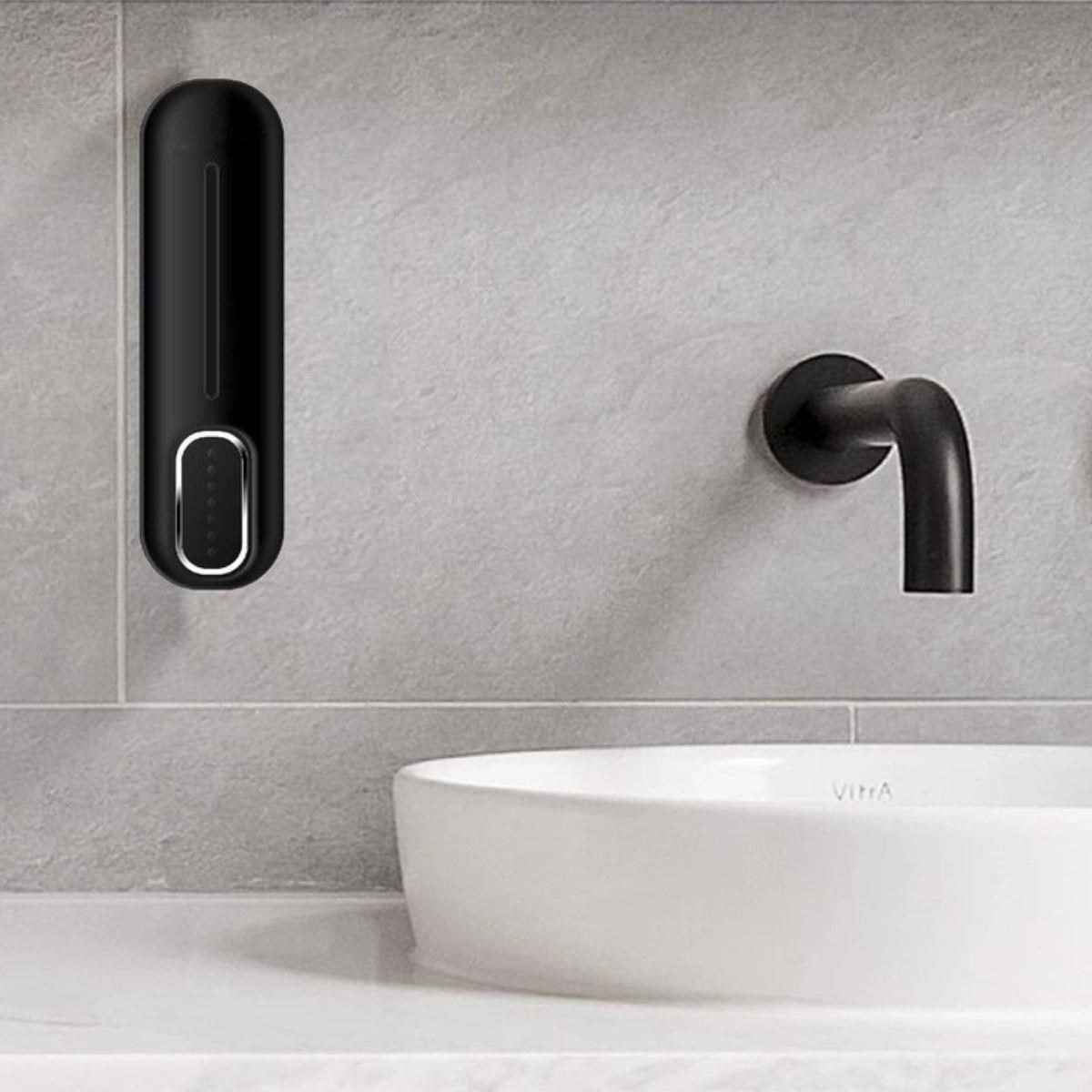 Bu siyah duvara monte sıvı sabunluk dispenser, modern ve şık tasarımıyla banyo veya mutfaklarınıza estetik bir dokunuş katarak hijyenik kullanım sunar.