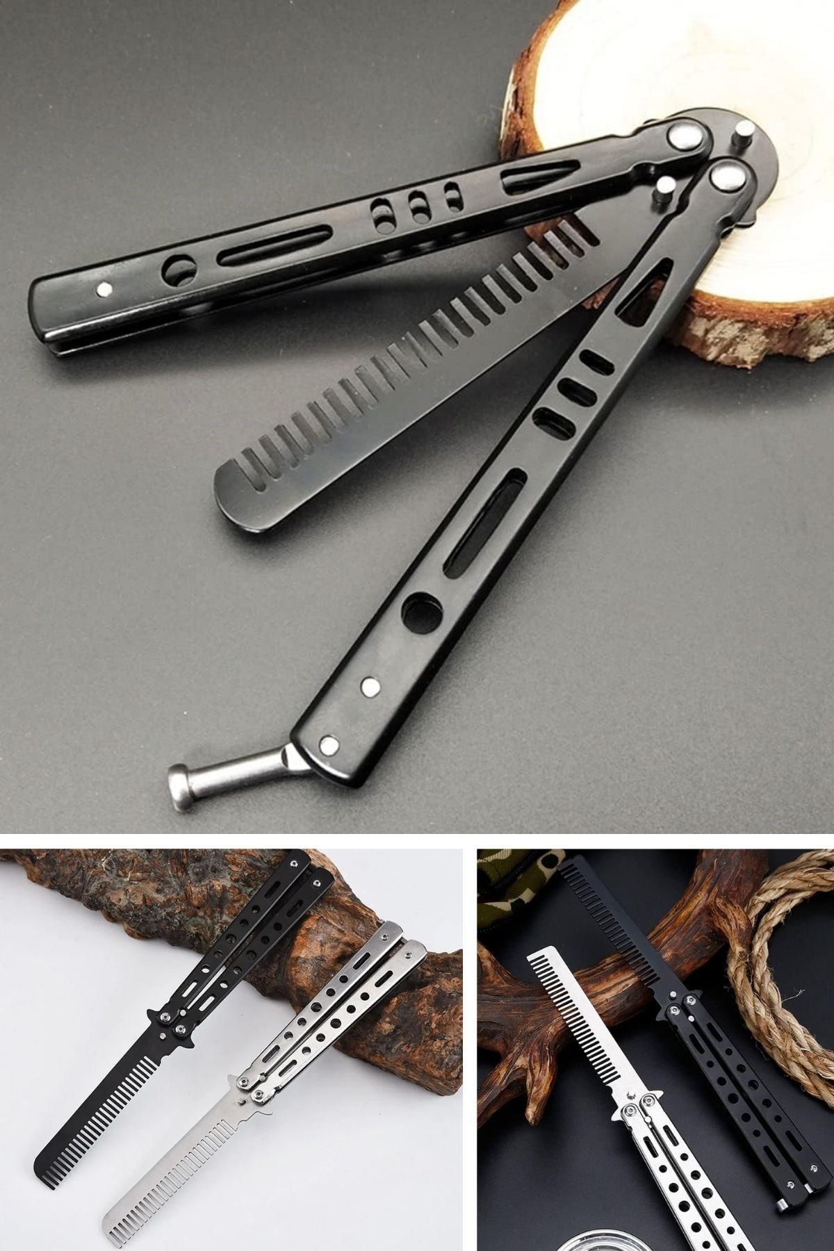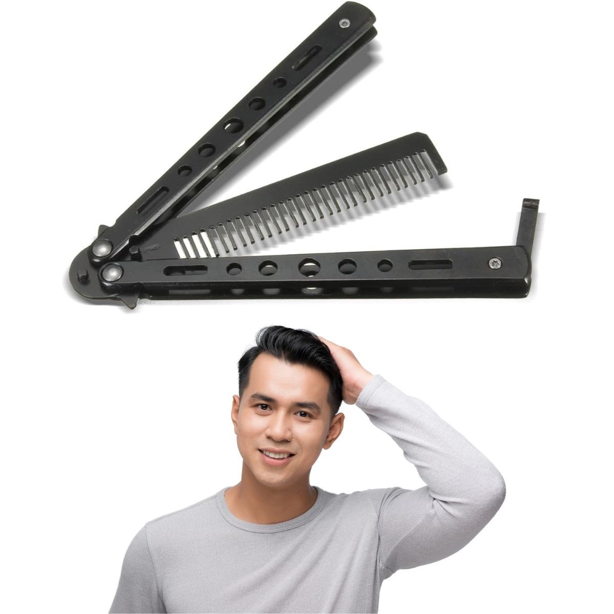 Biyomak® Siyah Katlanabilir Paslanmaz Çelik Kelebek Bıçak Tarak – Sakal & Bıyık Fırçası, Profesyonel Saç Kesimi İçin Tarak