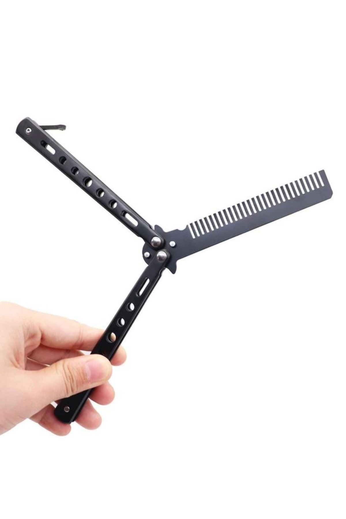 Biyomak® Siyah Katlanabilir Paslanmaz Çelik Kelebek Bıçak Tarak, hem profesyonel berberler hem de kişisel bakımına özen gösterenler için özel olarak tasarlanmıştır. Şık ve ergonomik yapısıyla kolay kullanım sunan bu tarak, saç, sakal ve bıyık bakımını zahmetsiz hale getirir.