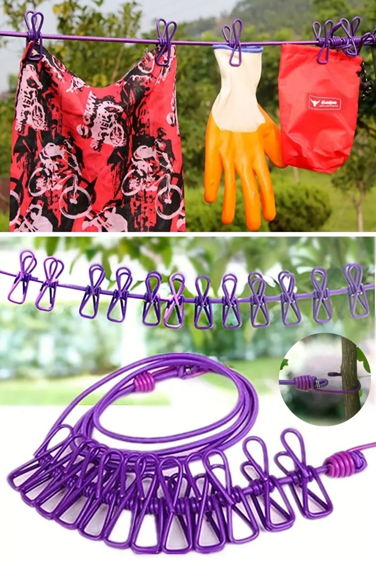 Biyomak® Taşınabilir Seyahat Çamaşır İpi 12 Klipsli Lastikli Çamaşır Mandalları