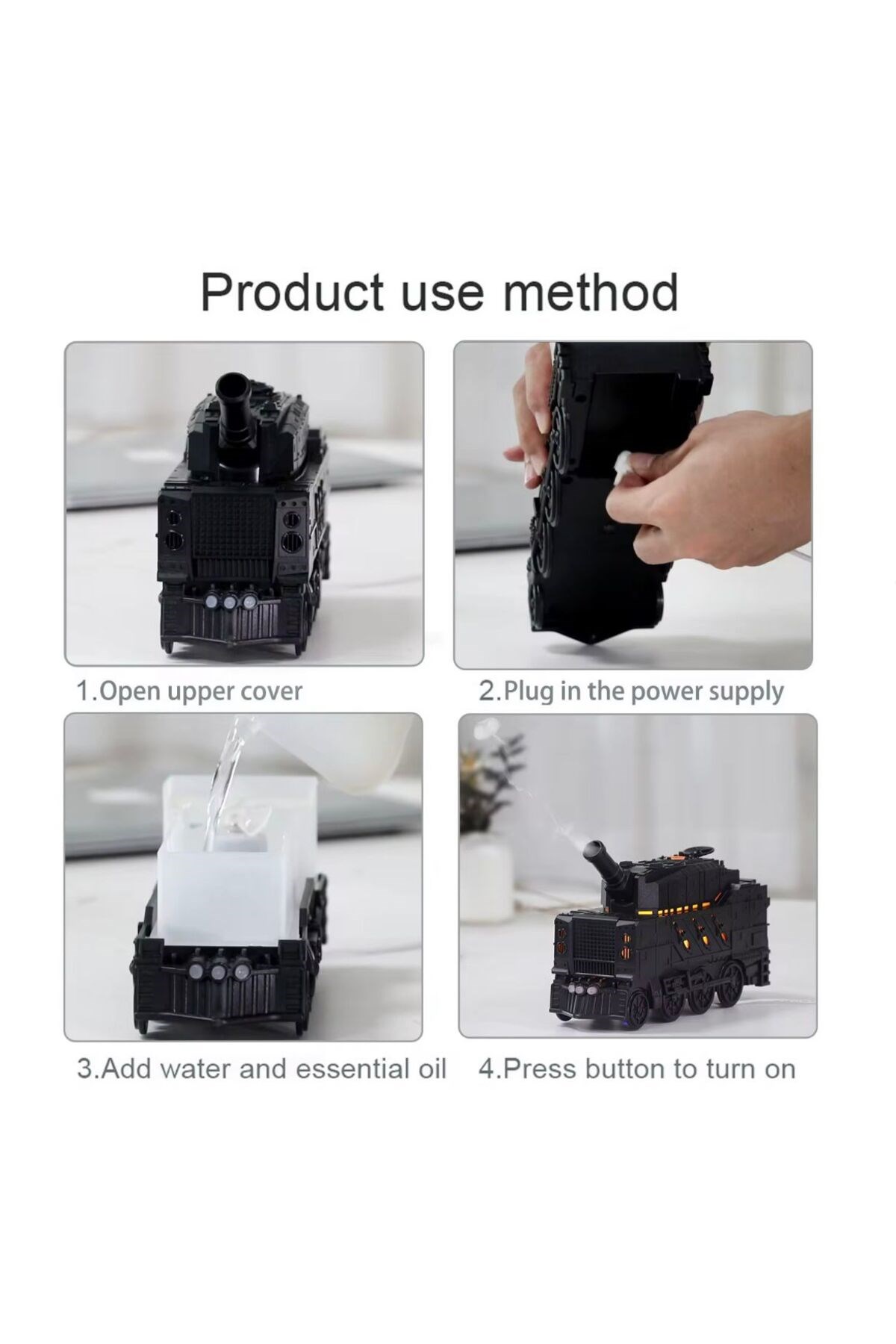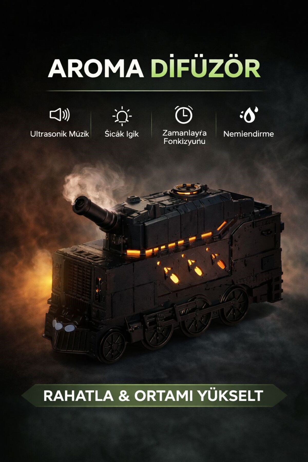 Bu özel tasarımlı buhar efektli zırhlı tren nemlendirici, hem dekoratif bir obje hem de güçlü bir hava nemlendirici olarak öne çıkar.; Gerçekçi duman efektiyle buharı bacasından püskürtür, ortama hoş bir atmosfer kazandırır.; LED aydınlatma detayları sayesinde karanlık ortamlarda büyüleyici bir görünüm sunar.; Sessiz çalışma teknolojisiyle gece kullanımlarında rahatsız etmez.;