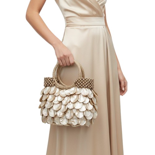 Yüzey formu, organik kesimli doğal sedef disklerin üst üste bindirilmesiyle oluşturulmuş çok katmanlı bir modül yapısına sahiptir. Bu yapı, çanta gövdesinde kontrollü bir hacim derinliği ve dinamik bir yüzey hareketi yaratırken, ışıkla temas eden her modülün bağımsız kırılım üretmesini sağlayacak biçimde konumlandırılmıştır. Katmanlar arasındaki milimetrik aralıklar, yüzeyde doğal bir akış hissi ve sofistike bir doku sürekliliği oluşturur.