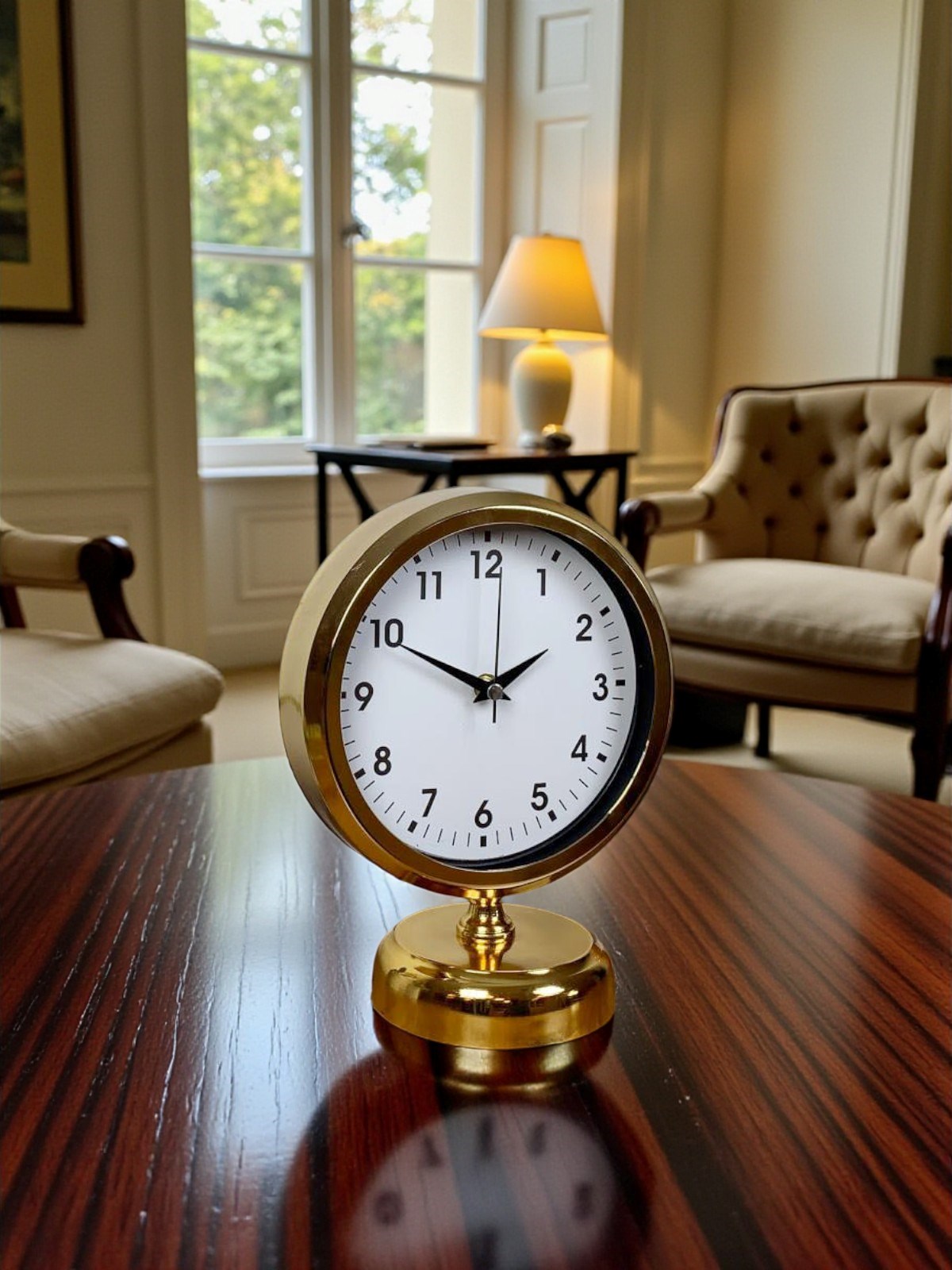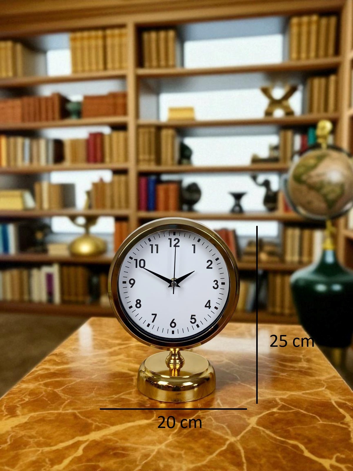 Parlak gold kaplaması ve sade beyaz kadranıyla öne çıkan bu masa saati, klasik ve modern çizgileri kusursuz bir uyumla bir araya getirir. Net ve okunaklı siyah rakamları sayesinde zamanı kolayca takip etmenizi sağlarken, dekoratif duruşuyla bulunduğu ortama prestij ve şıklık kazandırır. Ofis masaları, salon konsolları, kitaplıklar ve çalışma alanları için hem estetik hem de fonksiyonel bir tamamlayıcıdır.