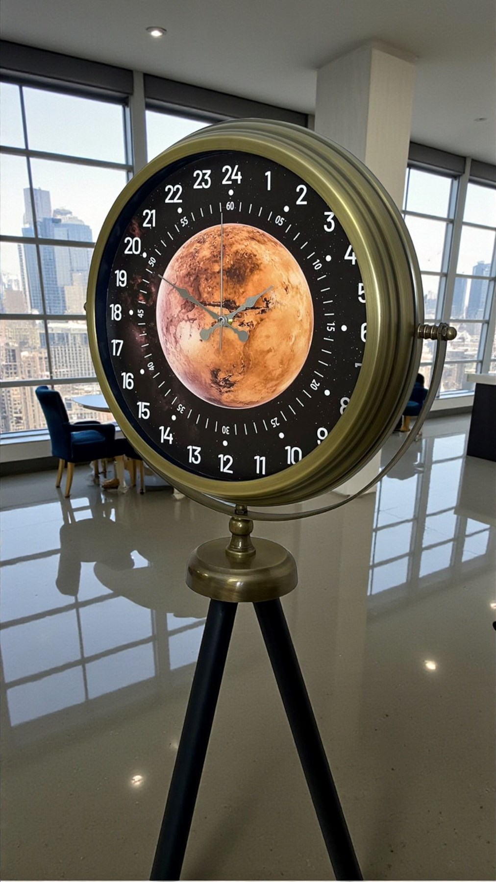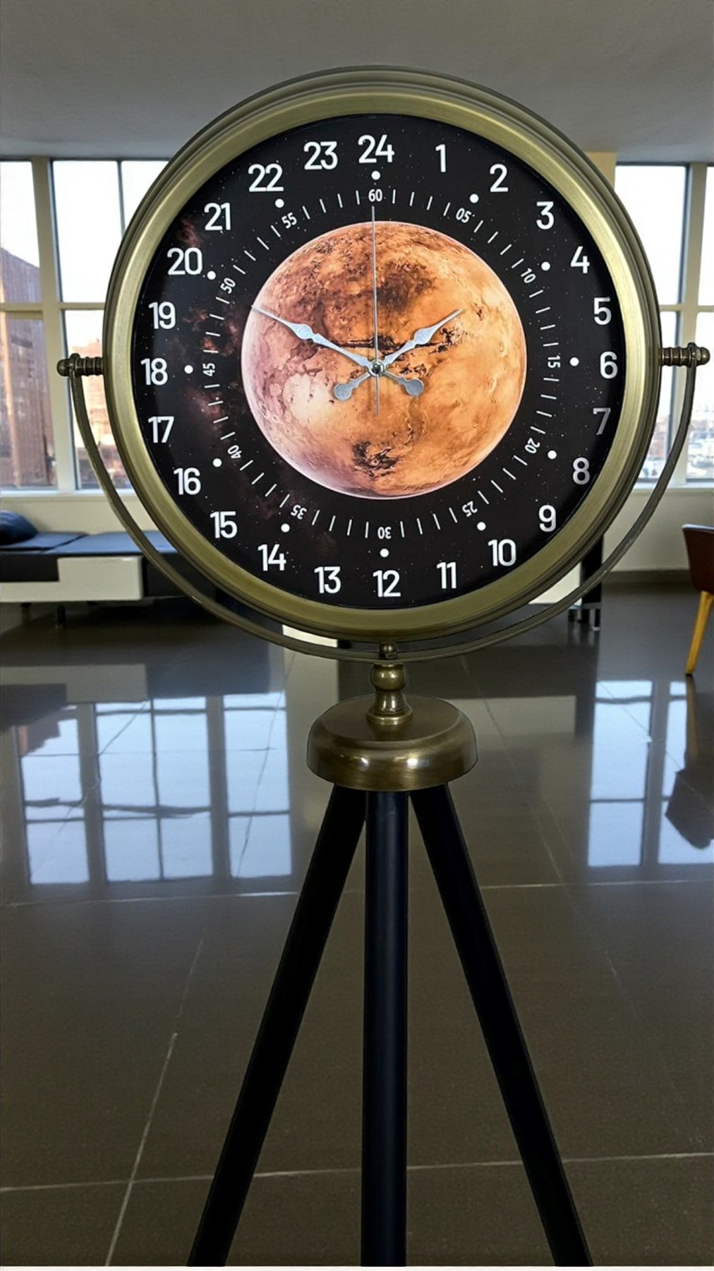 Saatin merkezinde yer alan 24 saat göstergesi, zamanı daha bütünsel ve profesyonel bir bakış açısıyla sunar. Özellikle ofisler, çalışma alanları, loft daireler, modern salonlar, oteller ve konsept mekânlar için dikkat çekici bir tasarım objesidir. Mars temalı kadran detayı, saate derinlik ve farklılık katarken, güçlü bir görsel etki oluşturur.
