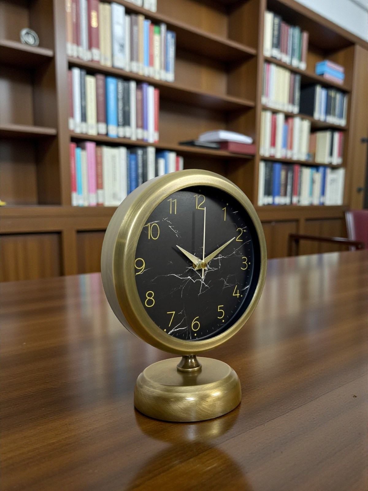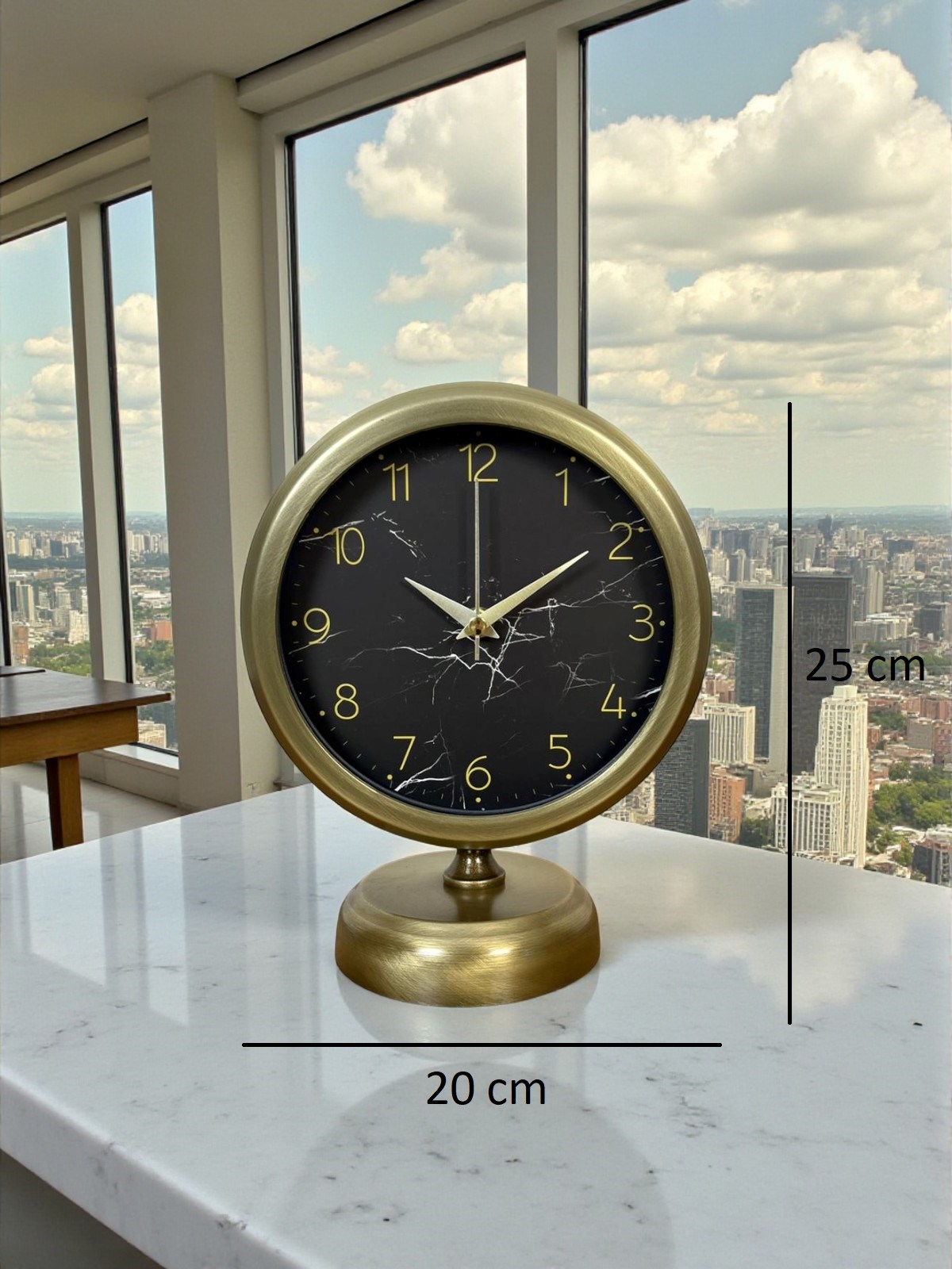 Şıklığı ve zarafeti bir arada sunan bu eskitme masa saati, modern mermer desenli kadranı ile klasik vintage tasarımı kusursuz şekilde birleştirir. Siyah zemin üzerine uygulanan mermer görünümlü desenler, saate sofistike ve premium bir karakter kazandırırken; gold tonlu rakamlar ve akrep-yelkovanlar ürünü estetik açıdan güçlü bir dekoratif obje haline getirir.