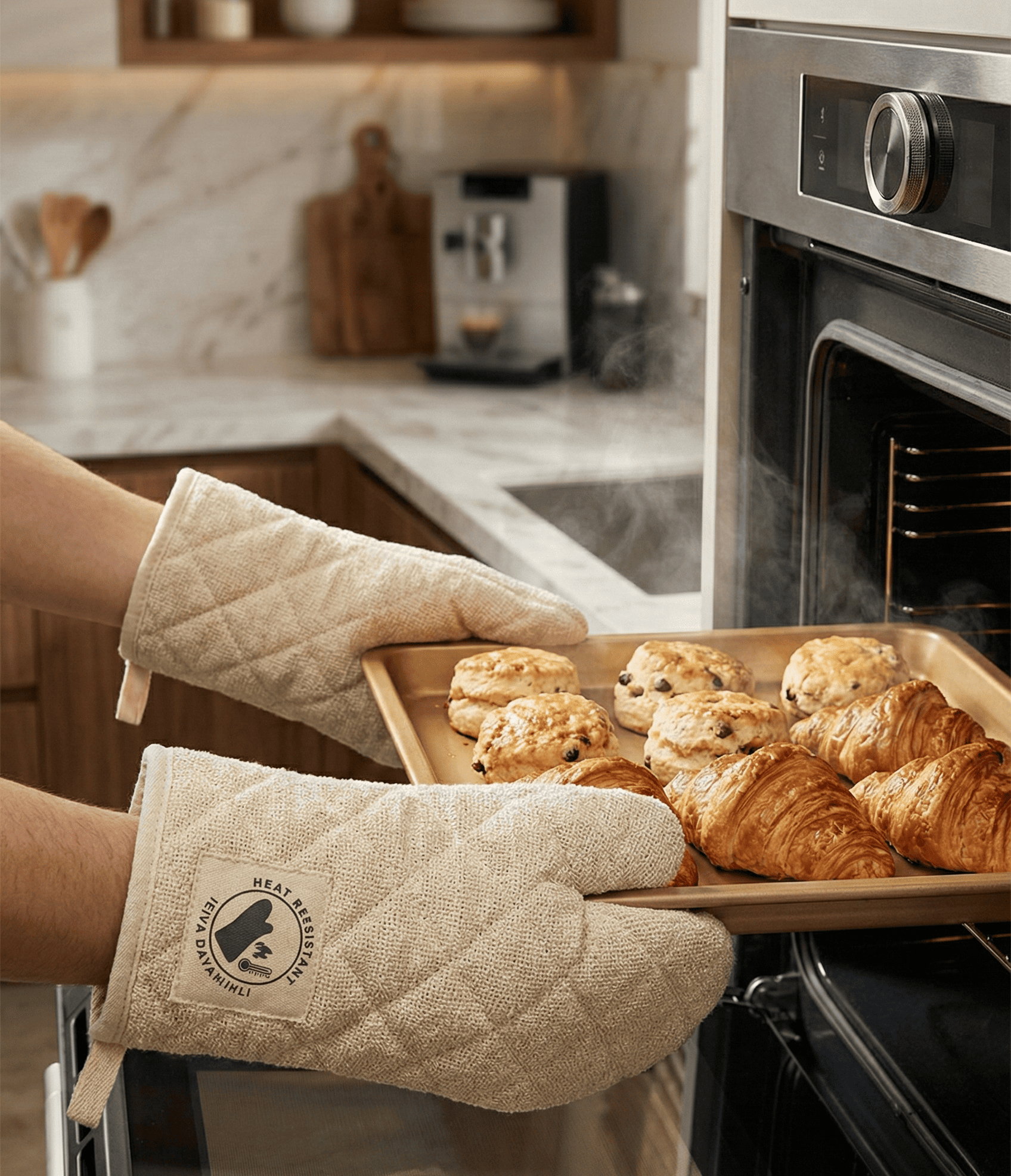 Kaymaz Doku: Fırın tepsisi, tencere veya tava taşırken elinizden kaymaz; ekstra güvenlik sunar.