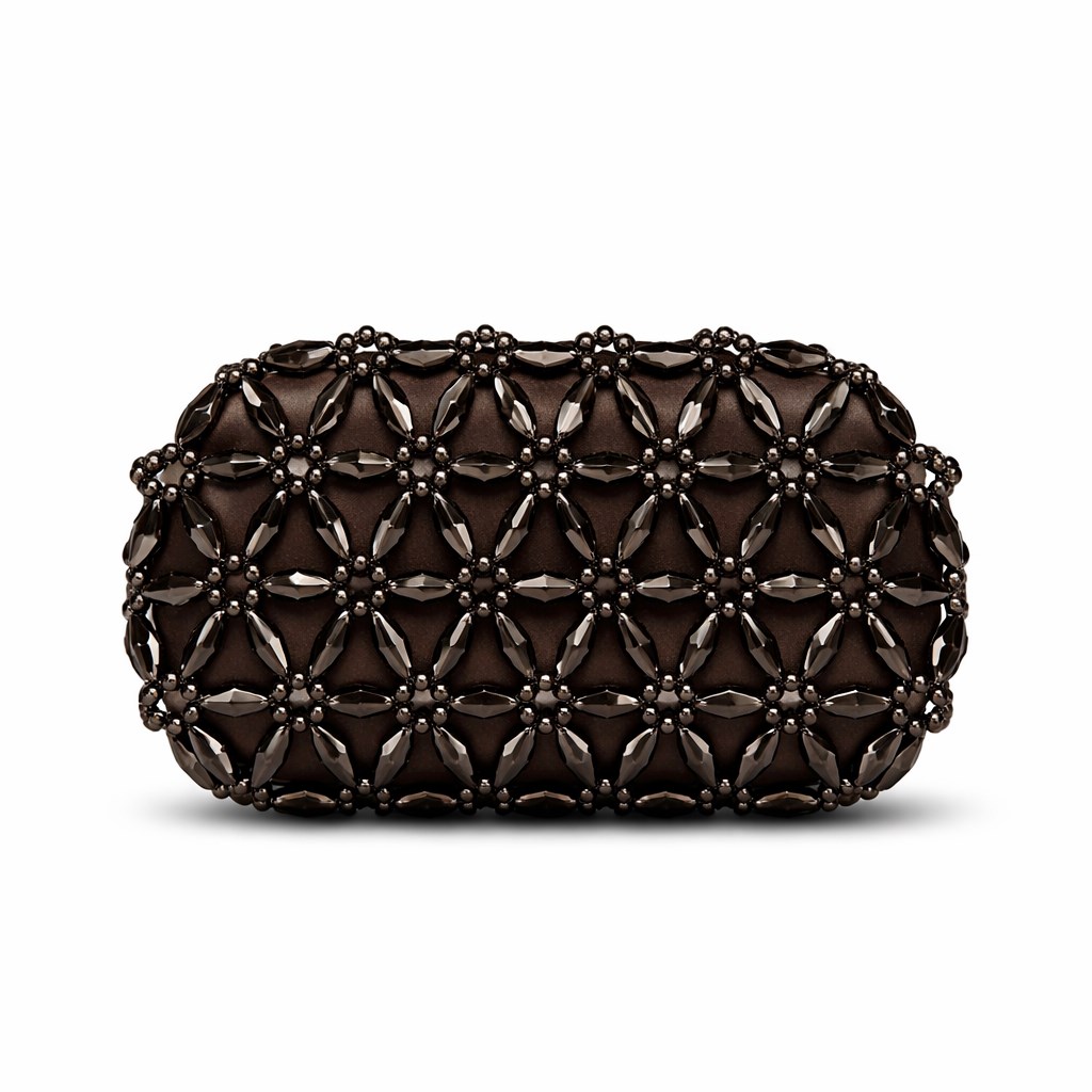 Çanta yüzeyi, her biri çok yüzeyli kesime sahip kristal boncukların dairesel halkalar oluşturarak birbirine bağlanmasıyla kurgulanmış açık kafes (lattice) strüktür üzerinden yükselir. Bu örgü sistemi, yüzeyde güçlü bir ışık kırılımı ve çok katmanlı bir doku derinliği yaratarak çantaya mücevher etkili, mimari bir karakter kazandırır.