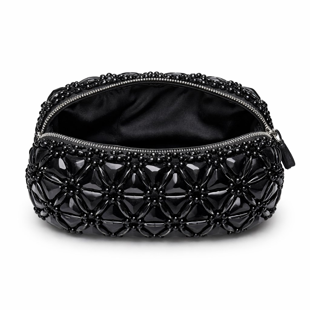 Çanta yüzeyi, her biri çok yüzeyli kesime sahip kristal boncukların dairesel halkalar oluşturarak birbirine bağlanmasıyla kurgulanmış açık kafes (lattice) strüktür üzerinden yükselir. Bu örgü sistemi, yüzeyde güçlü bir ışık kırılımı ve çok katmanlı bir doku derinliği yaratarak çantaya mücevher etkili, mimari bir karakter kazandırır.