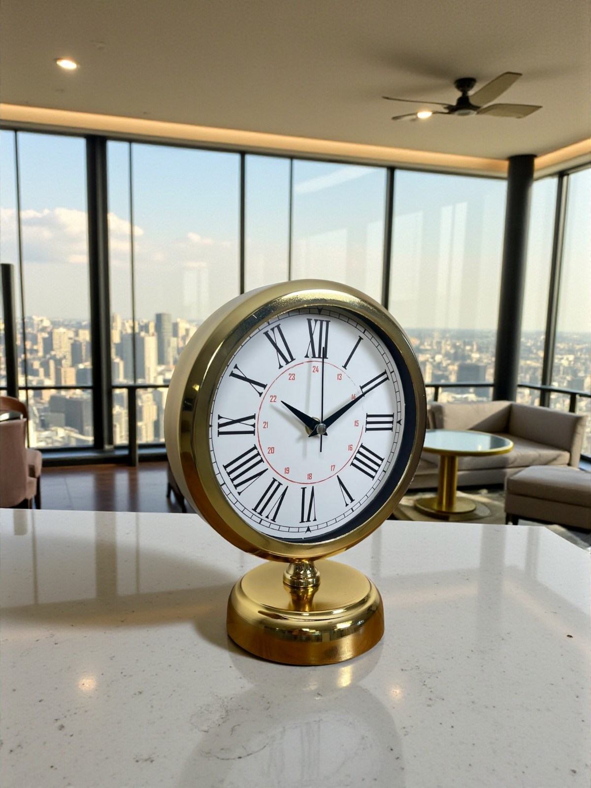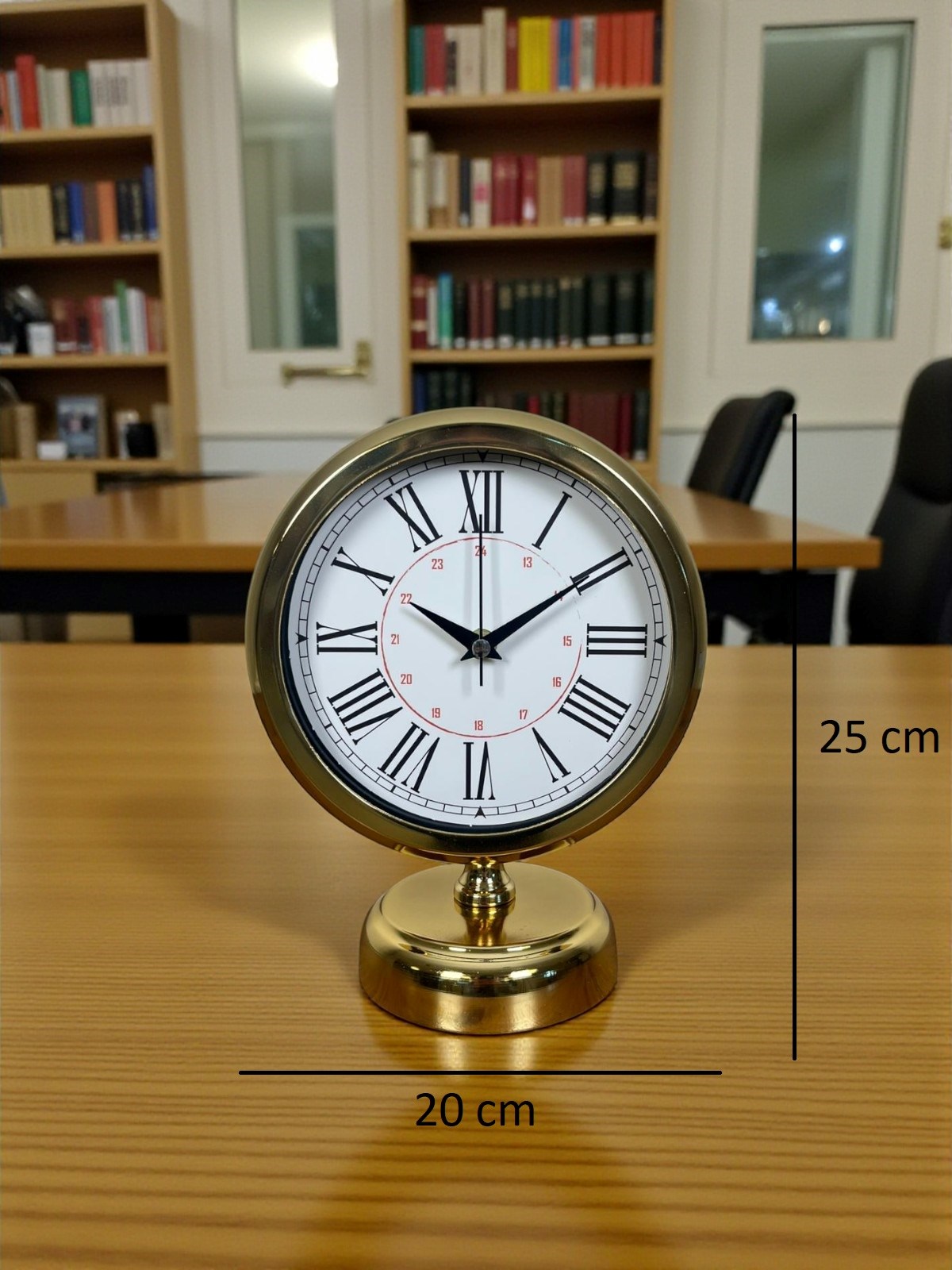 Klasik dekorasyonun vazgeçilmezi olan Roma rakamları, gold kasanın ışıltısı ve sade kadran tasarımıyla birleşerek bu masa saatini hem şık bir aksesuar hem de günlük kullanımda pratik bir ürün haline getiriyor. 25 x 20 cm ölçüsü sayesinde masada yer kaplamadan dikkat çeker; çalışma masası, salon konsolu, raf veya komodin üzerinde bulunduğu ortama anında zarif ve prestijli bir hava katar.