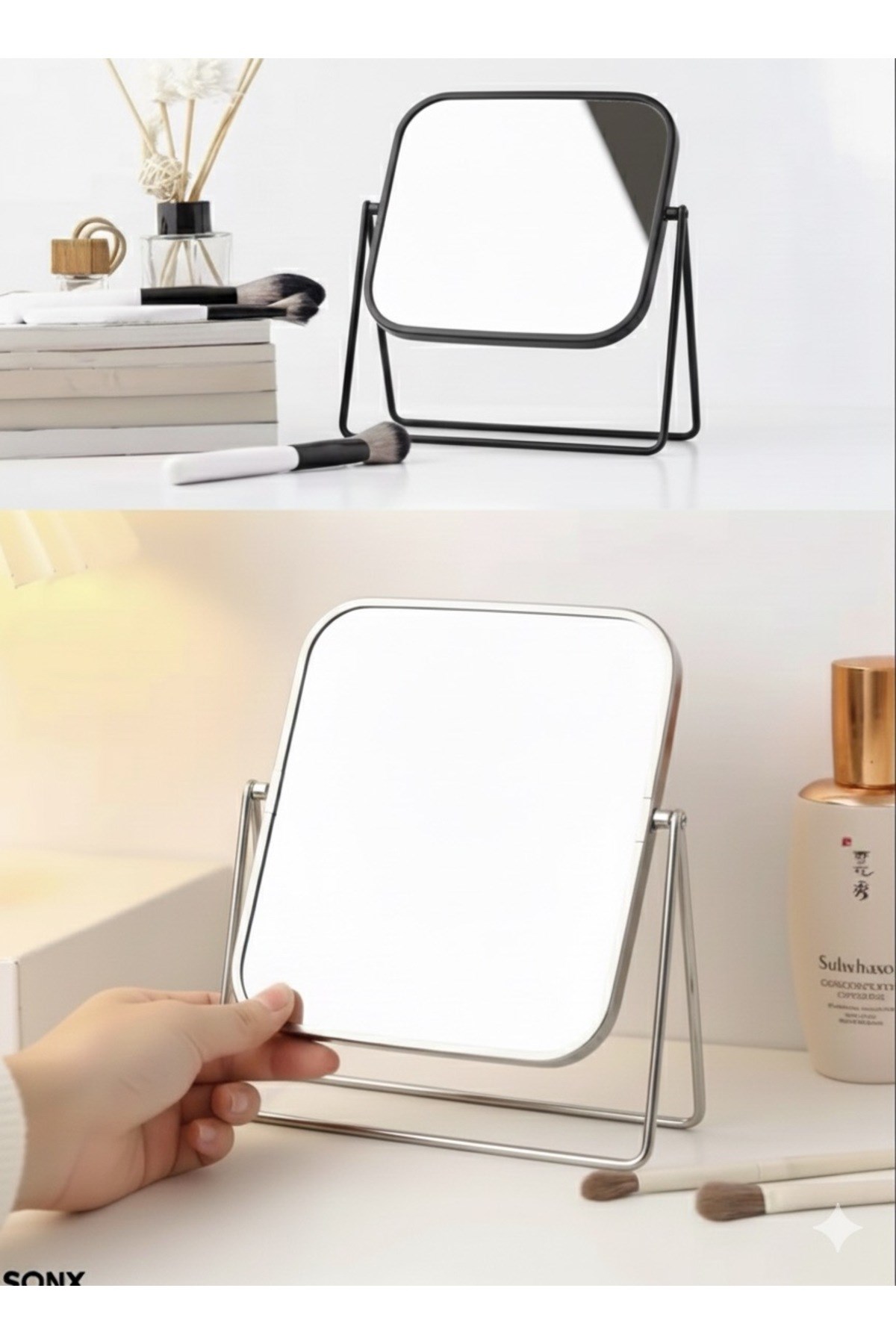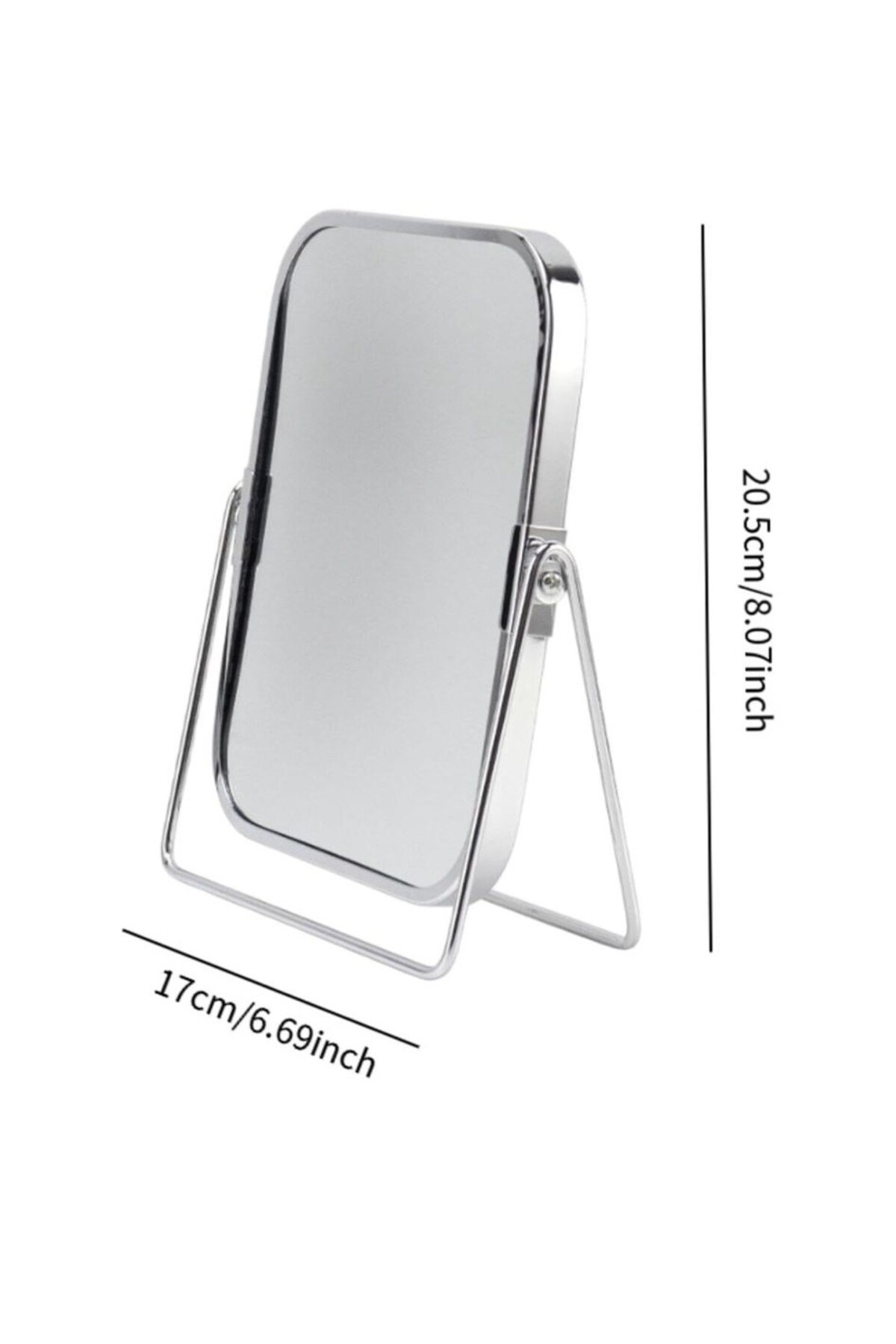 Modern ve şık tasarımıyla dikkat çeken bu dikdörtgen masa üstü ayna, günlük bakım, makyaj ve saç düzenleme işlemleriniz için ideal bir yardımcıdır.; Dayanıklı metal standı sayesinde sağlam duruş sağlar ve katlanabilir yapısı ile kolayca taşınabilir.; Krom kaplama çerçevesi hem estetik bir görünüm sunar hem de her türlü dekorasyonla uyum sağlar.; Ayna yüzeyi net ve kaliteli görüş sunar, gerçek renk ve detayları distortion (bozulma) olmadan yansıtır.; Minimalist tasarımıyla çalışma masası, makyaj masası veya banyo tezgâhı için mükemmel bir tamamlayıcıdır.; Özellikler: • Şık krom çerçeve • Katlanabilir metal stand • Masaüstü kullanıma uygun • Taşınabilir, hafif ve dayanıklı yapı • Net ve gerçekçi ayna yansıması • Makyaj, bakım, tıraş ve dekoratif kullanım için ideal