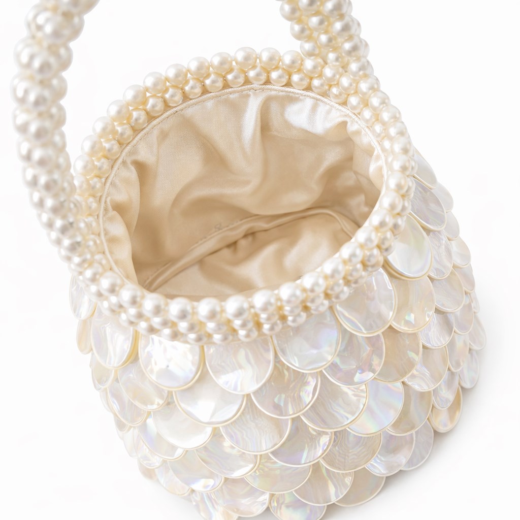 Çantanın dış yüzeyi, damla formunda hassas kesilmiş doğal sedef modüllerin, kontrollü bindirme (overlapping) tekniğiyle üç boyutlu bir kabuk mimarisi oluşturacak şekilde kurgulanmasıyla meydana gelir. Bu ölçekli katmanlama sistemi, yüzeyde ritmik bir akış sağlarken; ışığın farklı açılardan kırılmasını optimize eden yarı-organik bir doku üretir. Her bir sedef plaka, doğal malzemenin lif yönüne paralel biçimde işlenmiş olup, yüzey boyunca homojen bir parlaklık dağılımı elde edilmiştir.