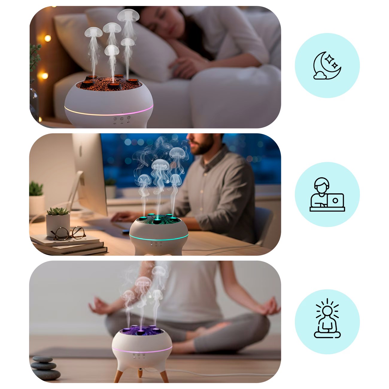 Jellyfish Ultrasonik Hava Nemlendirici, hem görsel hem de fonksiyonel özellikleriyle evinizde veya ofisinizde ferah ve konforlu bir hava deneyimi sunar. Kompakt tasarımı sayesinde her ortamda kolaylıkla kullanılabilir.