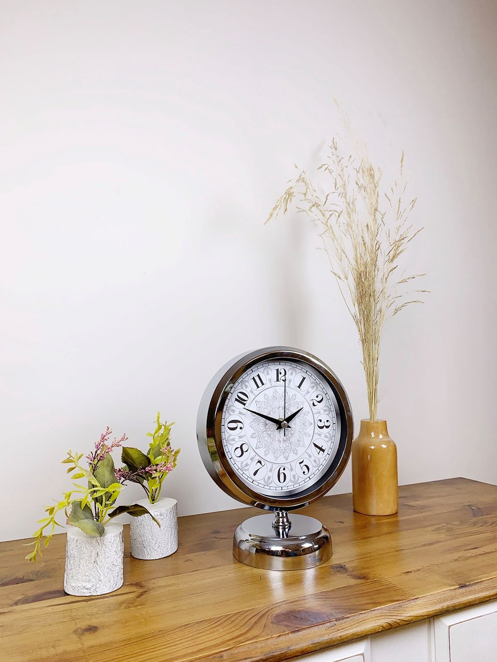Şık ve modern tasarımıyla dikkat çeken  krom kaplama masa saatimiz, sessiz akar saniye mekanizmasıyla konforlu bir kullanım sunar. Gerçek cam koruma paneli sayesinde uzun ömürlü ve dayanıklıdır. Estetik görünümüyle hem ev hem de iş yerleri için ideal bir dekoratif üründür.