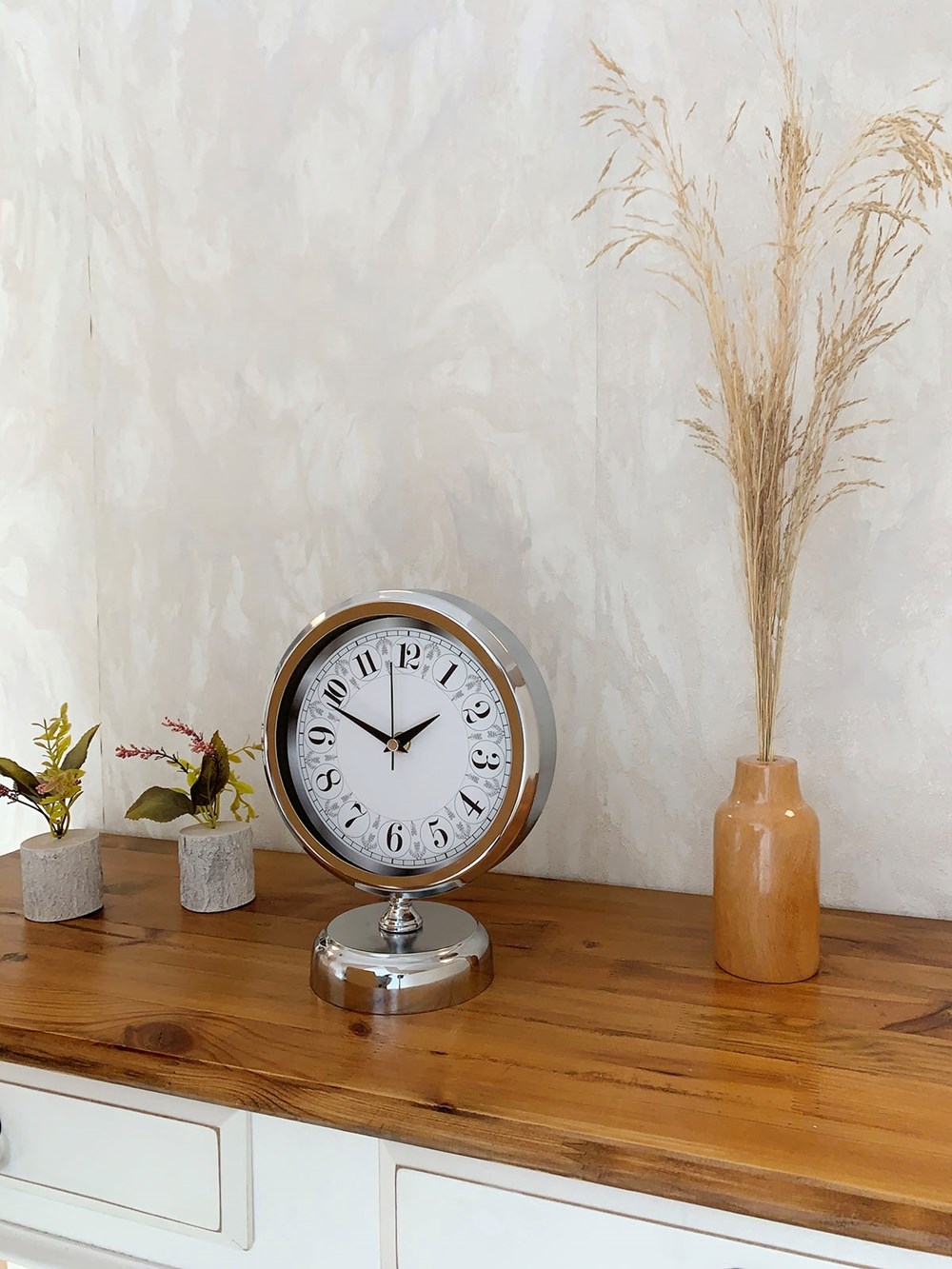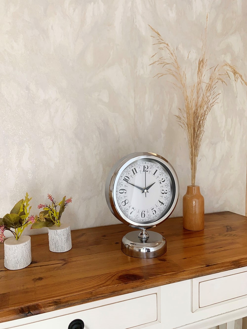 Şık ve modern tasarımıyla dikkat çeken  krom kaplama masa saatimiz, sessiz akar saniye mekanizmasıyla konforlu bir kullanım sunar. Gerçek cam koruma paneli sayesinde uzun ömürlü ve dayanıklıdır. Estetik görünümüyle hem ev hem de iş yerleri için ideal bir dekoratif üründür.